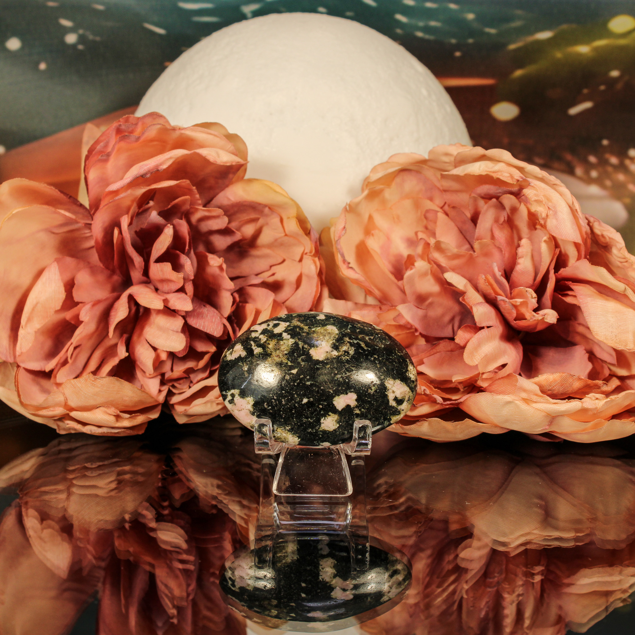 De khybersteen handsteen is een mysterieuze en beschermende edelsteen die kracht, rust en helderheid uitstraalt. Deze bijzondere steen heeft meestal een diepzwarte of grijsgroene basis, versierd met subtiele lichtroze spikkels of insluitsels. Die zachte kleuraccenten geven de steen een verrassend vriendelijke uitstraling, die mooi contrasteert met zijn stevige, aardende energie. In Pakistan wordt hij soms verkocht onder de handelsnaam sneeuwvlok obsidiaan, vanwege het gespikkelde uiterlijk. Toch is khybersteen geen obsidiaan, maar een ander type mineraal met een eigen unieke samenstelling en werking. In de mineralogie staat deze steen ook bekend als hoornblende.