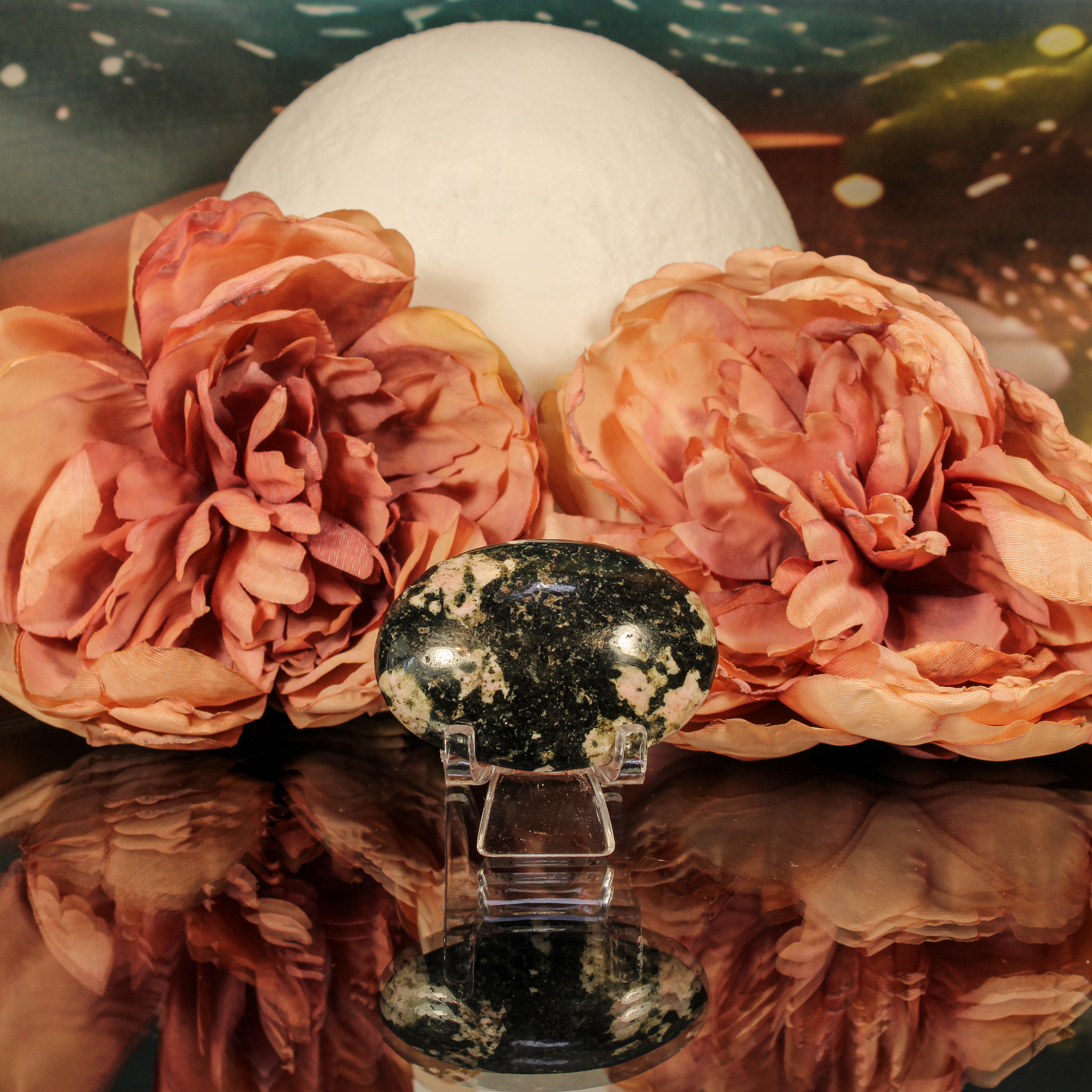 Je hoeft niet spiritueel te zijn om deze natuursteen te waarderen. De diepe kleur, contrasterende patronen en subtiele roze details maken hem tot een stijlvolle blikvanger in elk interieur. Plaats de handsteen op een mooie houder zodat het licht de nuances benadrukt, of leg hem in een schaal met andere edelstenen voor een speels en stijlvol effect. Zo past hij moeiteloos in zowel een modern als een landelijk interieur en geeft hij een natuurlijk accent aan je huis of werkplek.