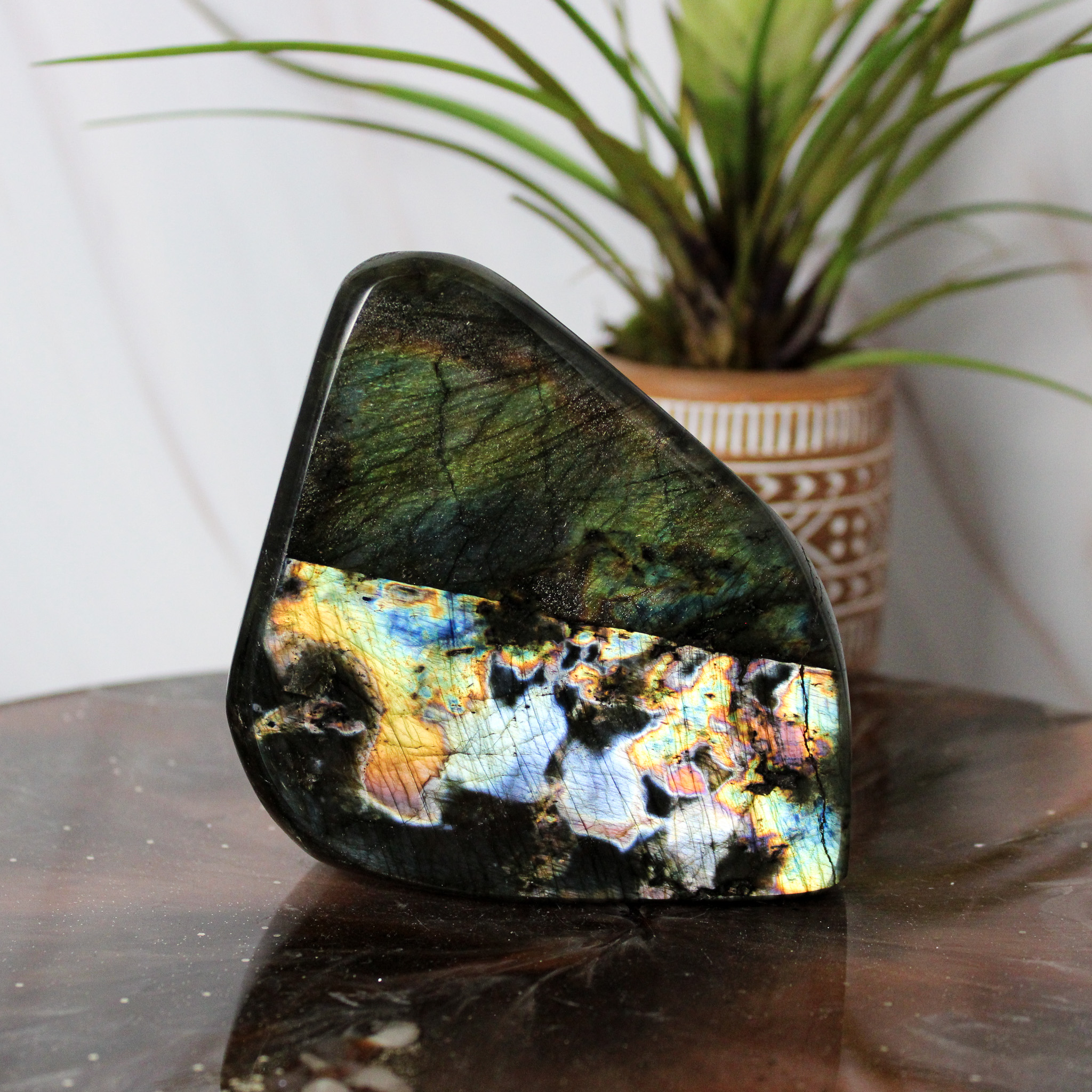 Labradoriet is een belangrijke beschermsteen. Hij beschermt en reinigt het eigen energieveld (aura) tegen negatieve invloeden uit de omgeving van mensen, entiteiten die je overprikkelen en energie bij je wegnemen. Wanneer je labradoriet tijdens meditatie op het derde oog neerlegt, kan je helderziende ervaringen krijgen. Labradoriet activeert het innerlijke oog, zodat je een beter beeld krijgt van het verleden en de toekomst. Deze steen vermindert stress, angst en geeft kracht, (zelf)vertrouwen en doorzettingsvermogen. Labradoriet geeft je rust en hij helpt je wanneer je moeite hebt met je concentratie. Deze steen helpt je met beide benen op de grond te staan en voor jezelf op te komen wanneer dit nodig is.