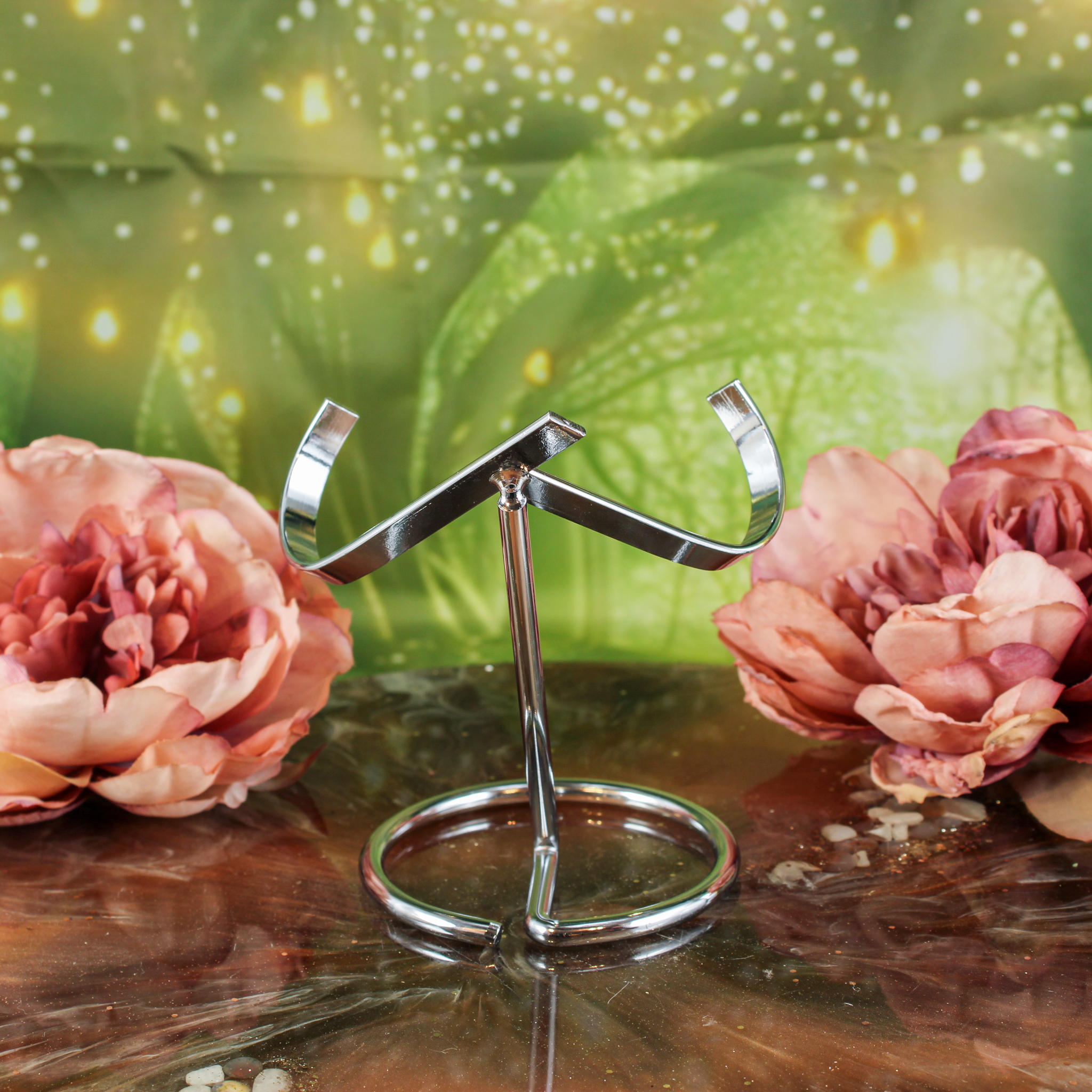 De metalen standaard voor edelstenen is ontworpen om stenen rechtop te presenteren. De gebogen draagarmen ondersteunen de steen aan beide zijden, waardoor er balans ontstaat. Daarnaast zorgt de ronde voet voor een stevige basis, zodat je de edelstenen houder veilig neerzet op een kast, plank, tafel of dressoir. Het open ontwerp zorgt er bovendien voor dat alle aandacht naar de steen gaat. Hierdoor blijven de vorm, kleur en natuurlijke structuur van de edelsteen goed zichtbaar.