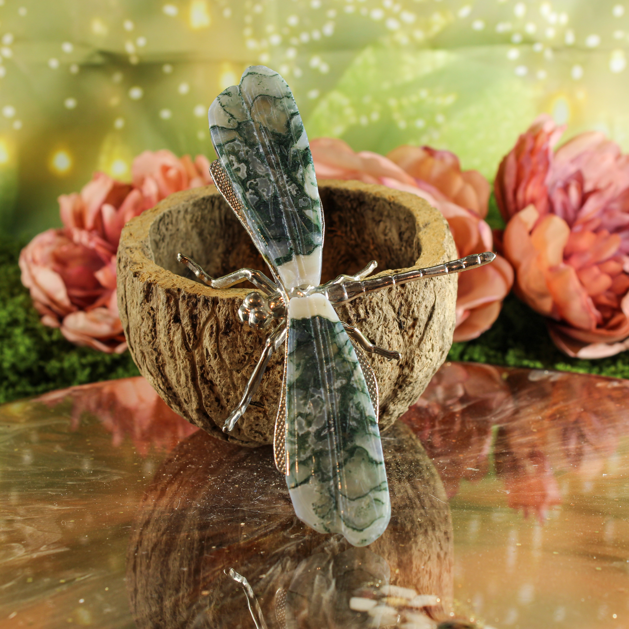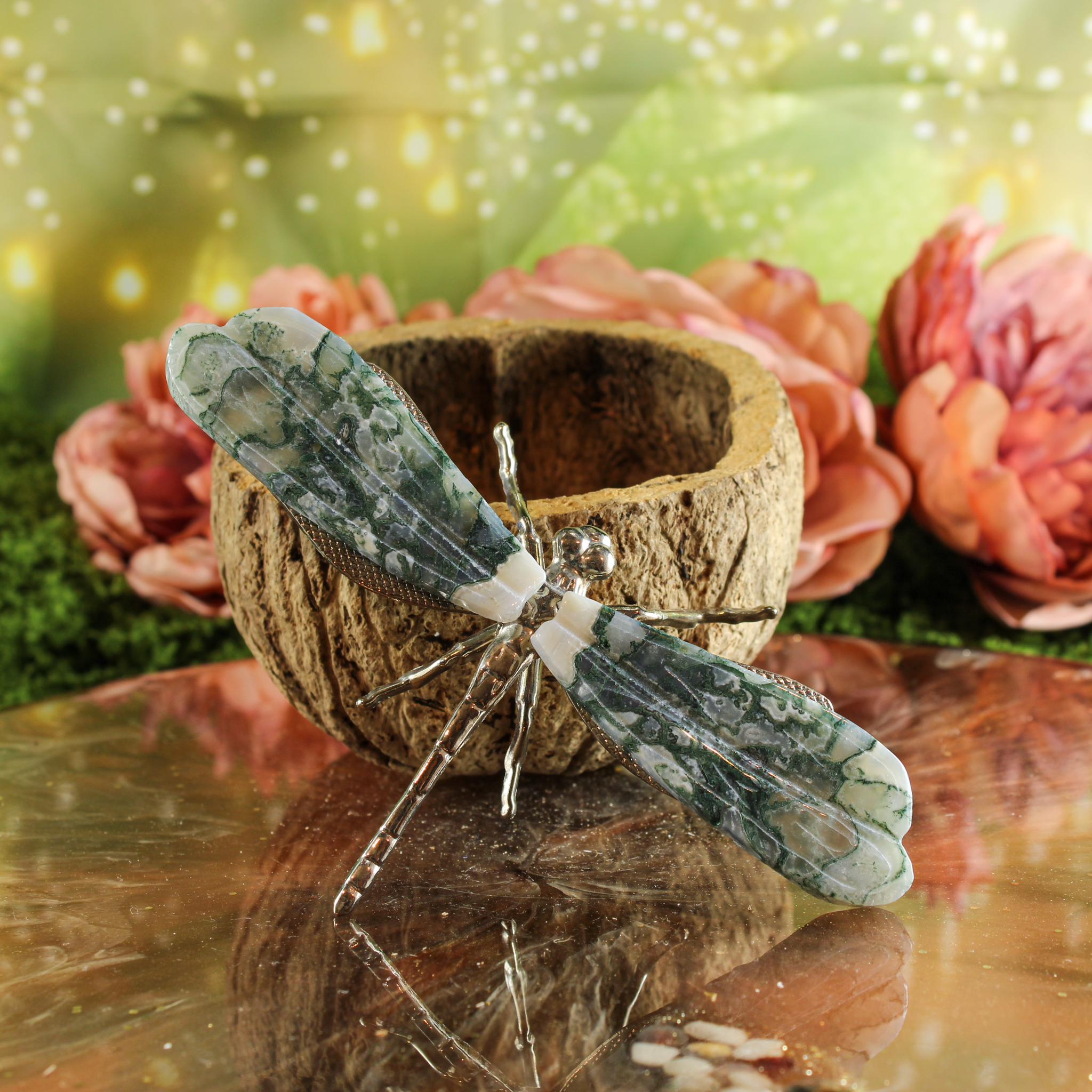 Deze mosagaat libelle is een uniek en sfeervol natuurproduct dat meteen opvalt door haar elegante vorm en zachte, natuurlijke uitstraling. De vleugels bestaan uit mosagaat met prachtige patronen die doen denken aan mos, takjes en kleine landschappen. In het midden zie je een zilverkleurig libellelijfje, wat het geheel een verfijnde en dromerige uitstraling geeft.
