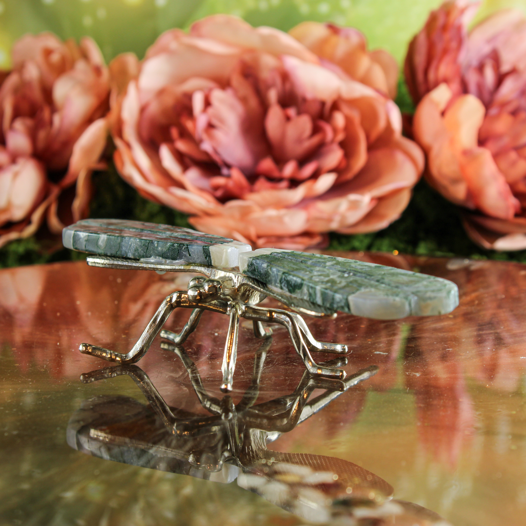 In de mosagaat ontdek je prachtige natuurlijke lijnen en patronen die elke libelle haar eigen uitstraling geven. De vleugels zijn in deze libellevorm geslepen en mooi gegraveerd, waardoor het geheel een elegante uitstraling krijgt en de details extra goed zichtbaar zijn.
