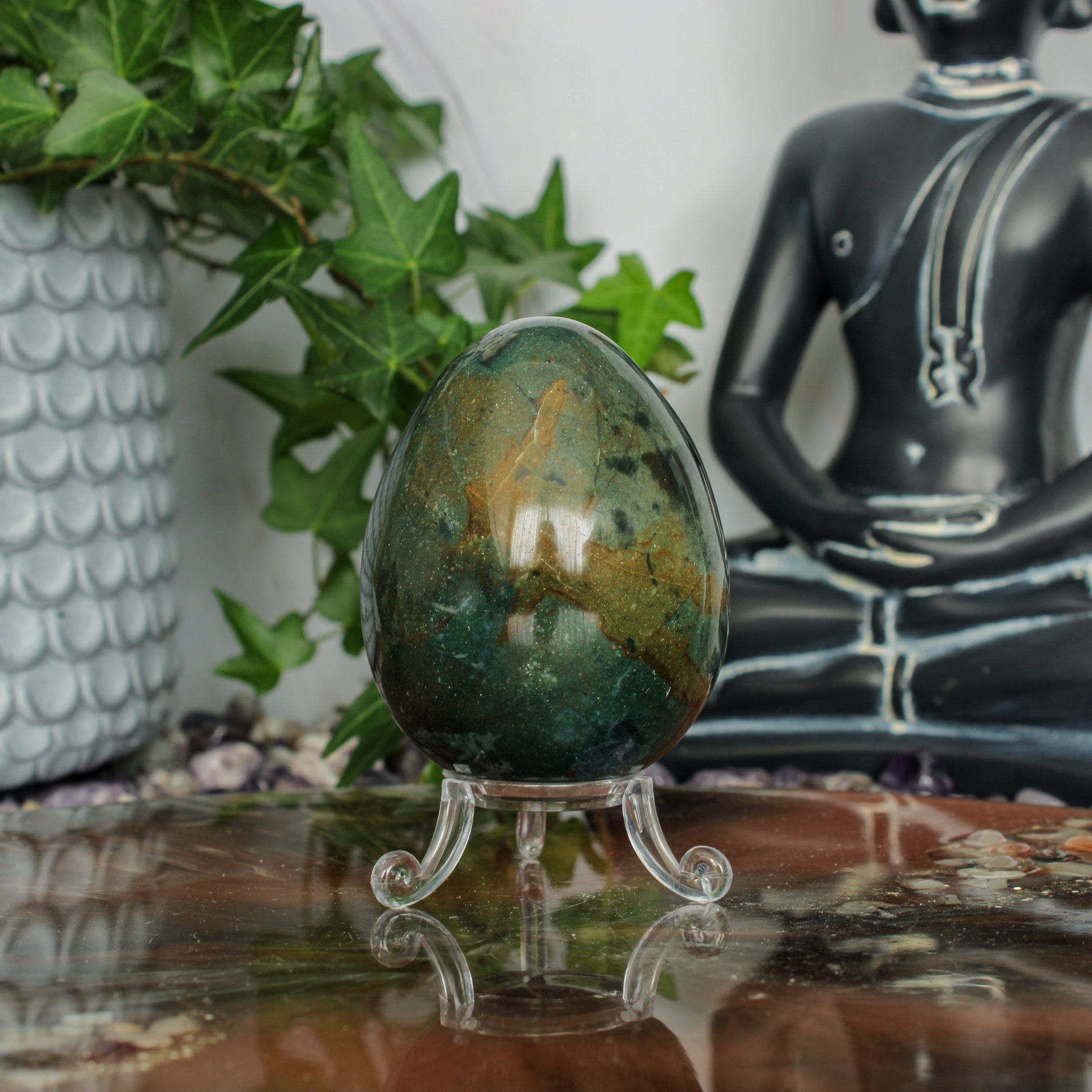 De ei-vorm geeft deze oceaan jaspis een zachte en harmonieuze uitstraling. Door de afgeronde lijnen voelt de vorm rustig en in balans.
