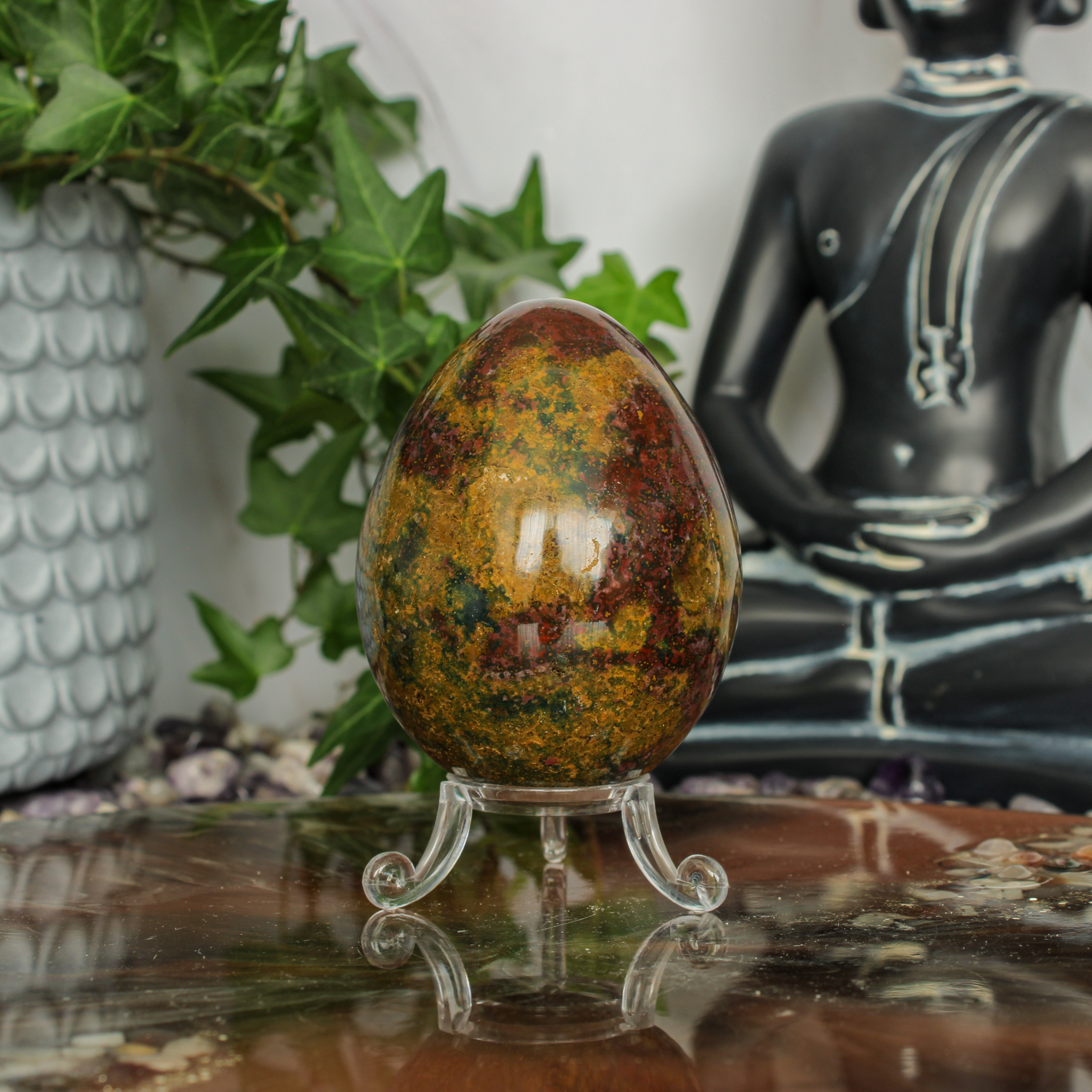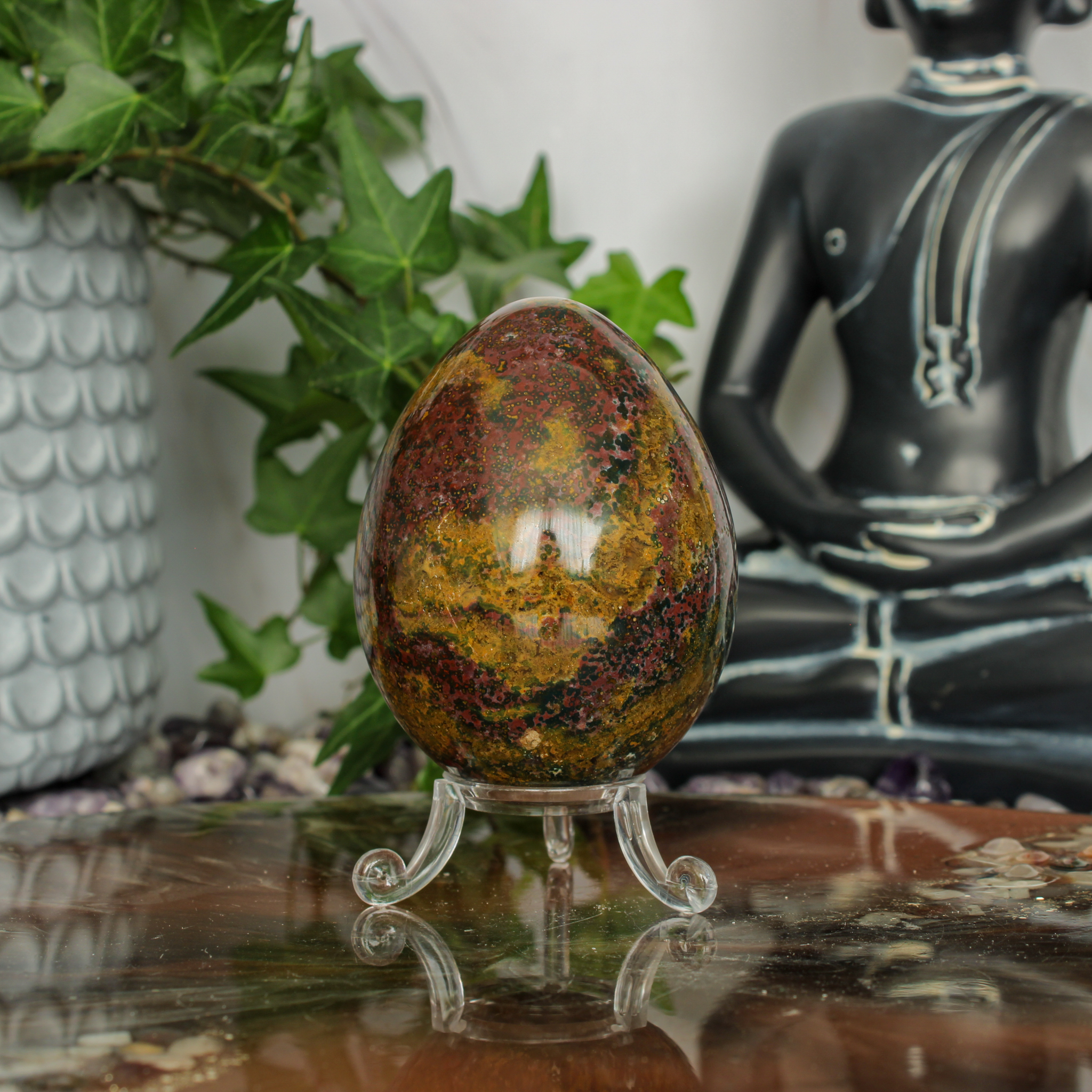 De ei-vorm geeft deze oceaan jaspis een zachte en harmonieuze uitstraling. Door de afgeronde lijnen voelt de vorm rustig en in balans.