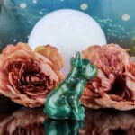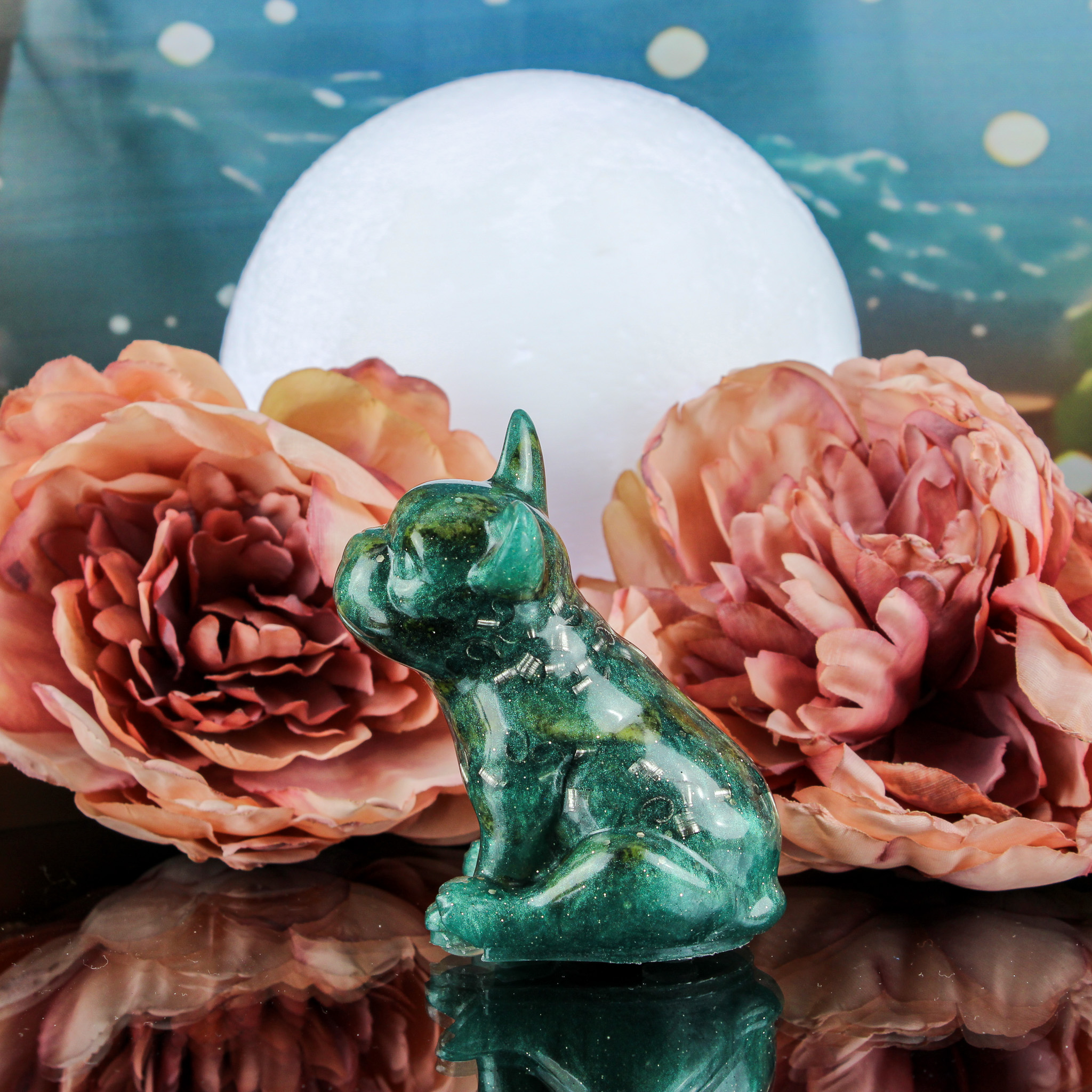 Naast metalen zit er in deze orgonite bulldog nefriet jade trommelsteentjes verwerkt. De afmetingen zijn ongeveer: L 4,4 x B 5,3 x H 7,6 cm.