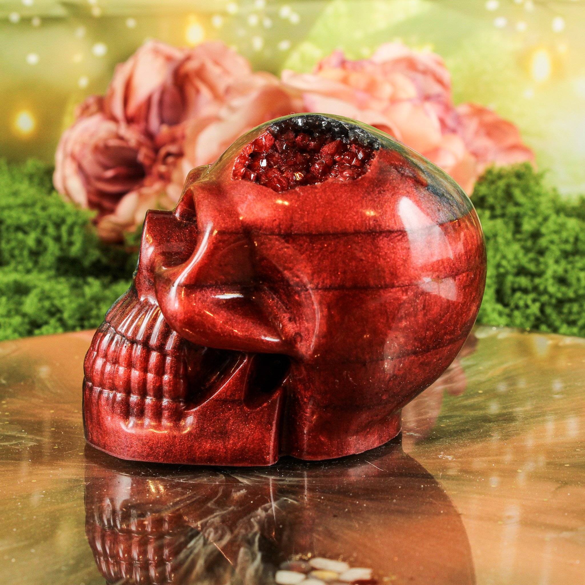 Bovenop de schedel bevindt zich een geode-achtige opening die ik tijdens het maken met een speciale vorm heb aangebracht. Deze opening geeft de schedel een mooi detail dat het geheel net dat beetje extra karakter geeft. Het licht benadrukt de opening op een zachte manier, waardoor de details mooi zichtbaar worden.