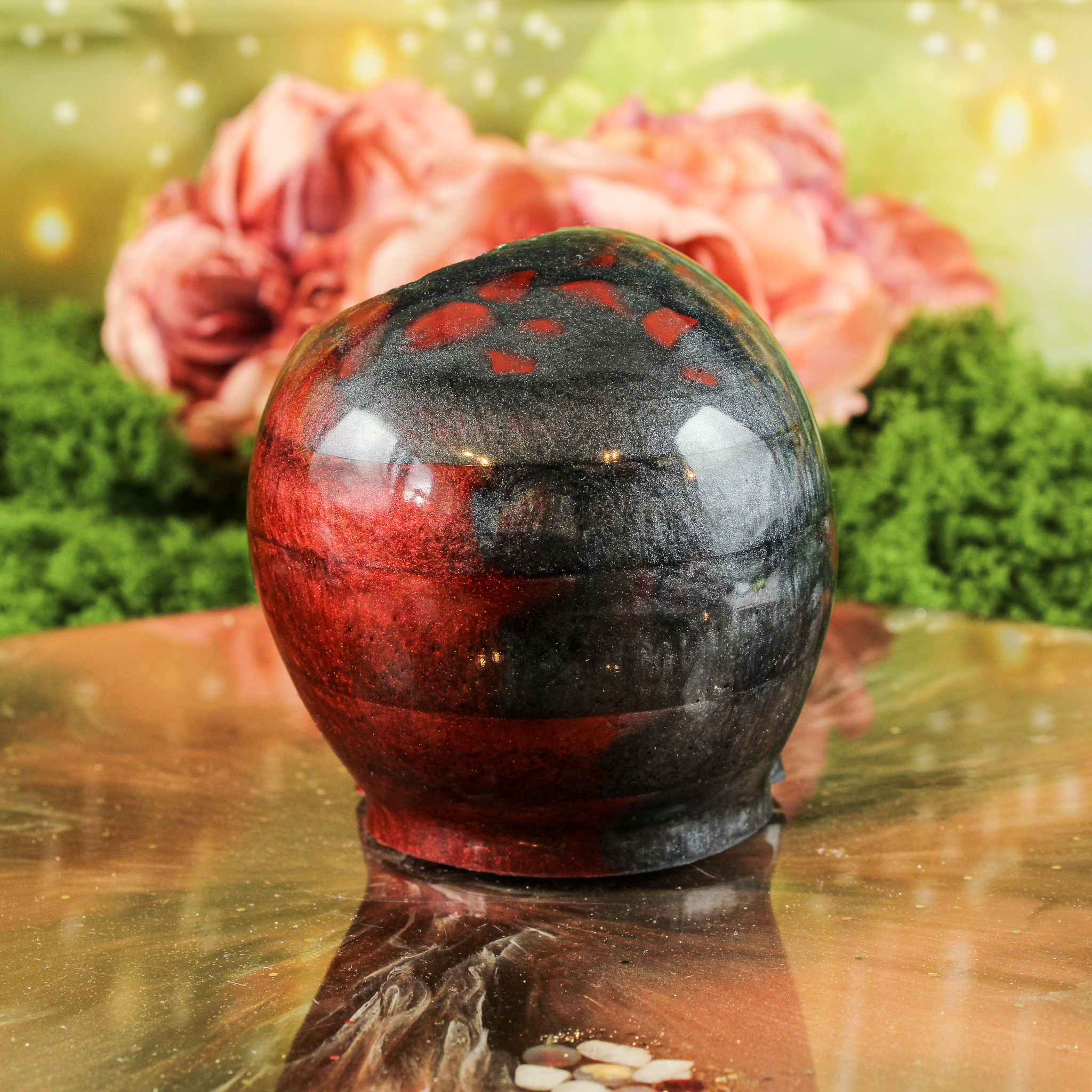 Deze orgonite schedel is een bijzonder en persoonlijk stuk dat ik met veel zorg en aandacht heb gemaakt. De ene helft laat warme roodtinten zien, terwijl de andere helft overgaat in zwart. Samen zorgen deze kleuren voor een rustig maar opvallend contrast dat het stuk extra karakter geeft. In de schedel zijn metalen en rode jaspis trommelsteentjes verwerkt, waardoor het geheel niet alleen mooi oogt, maar ook een warme en ondersteunende energie met zich meedraagt.