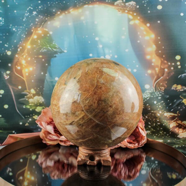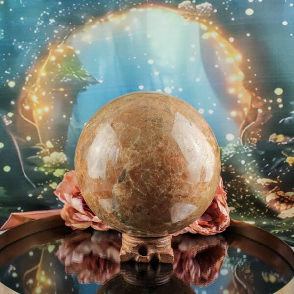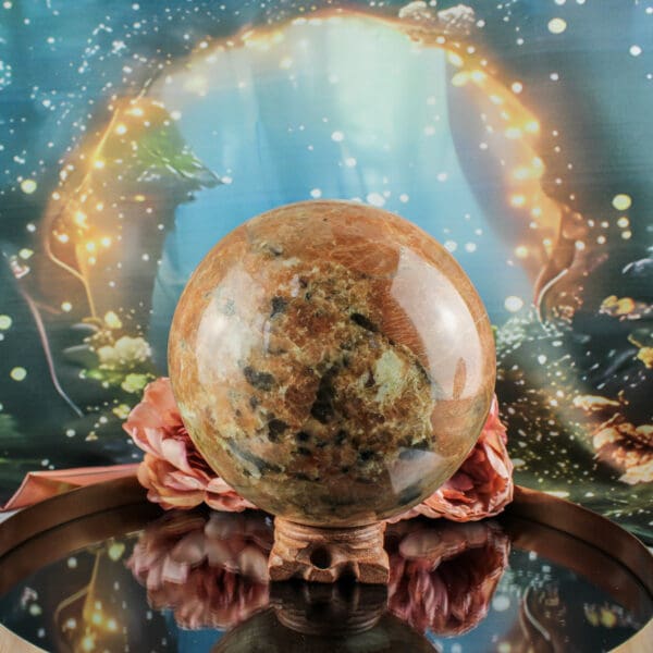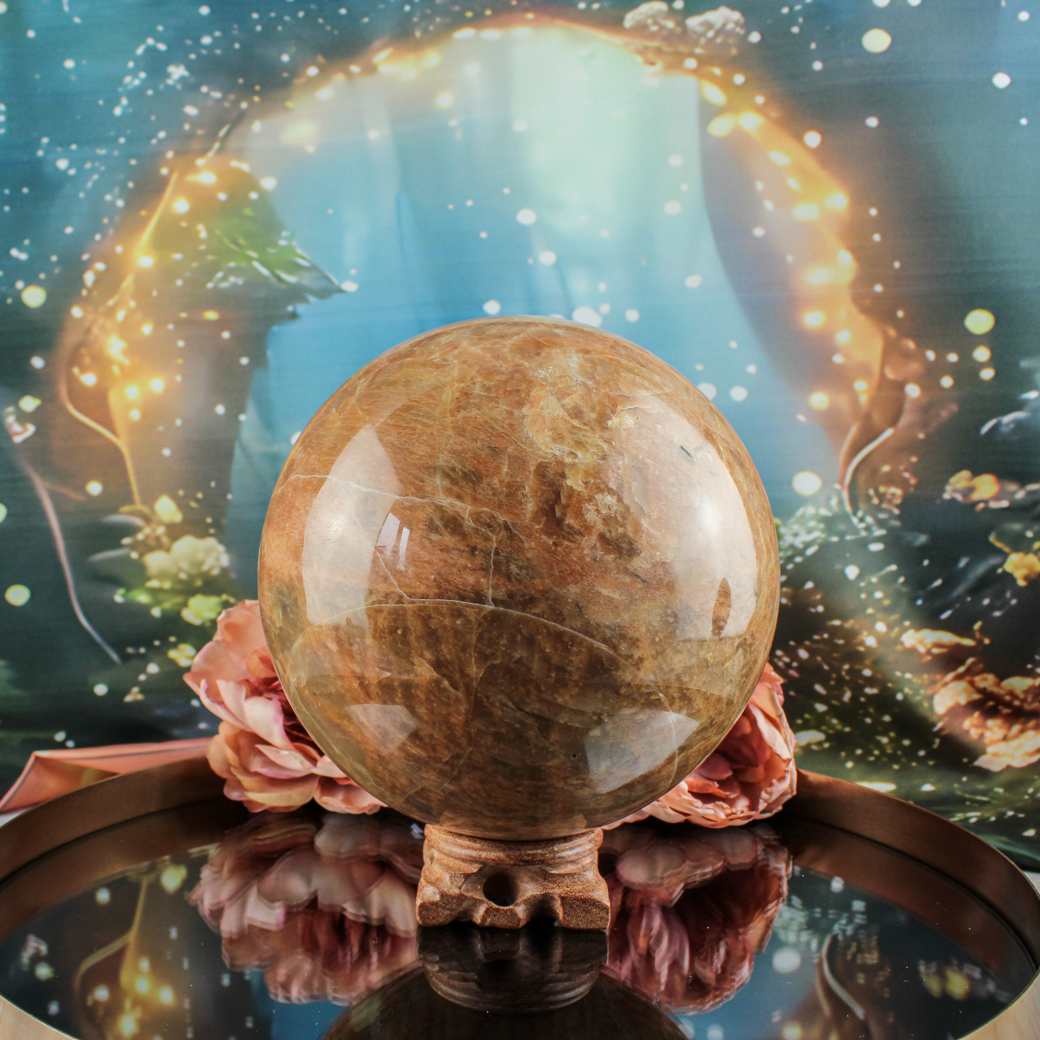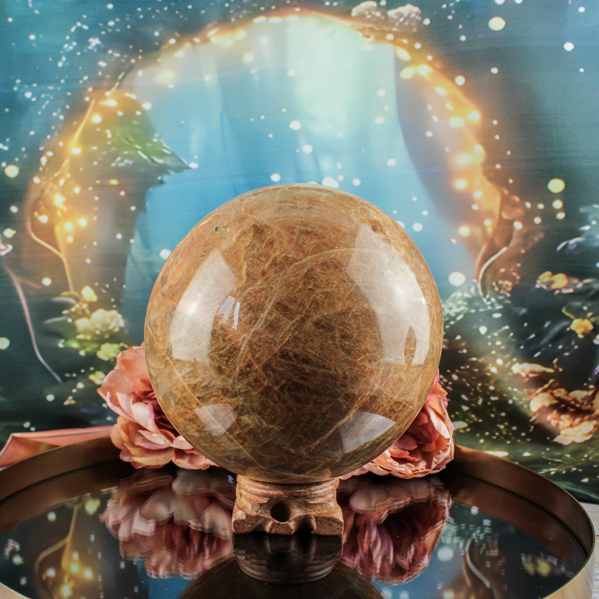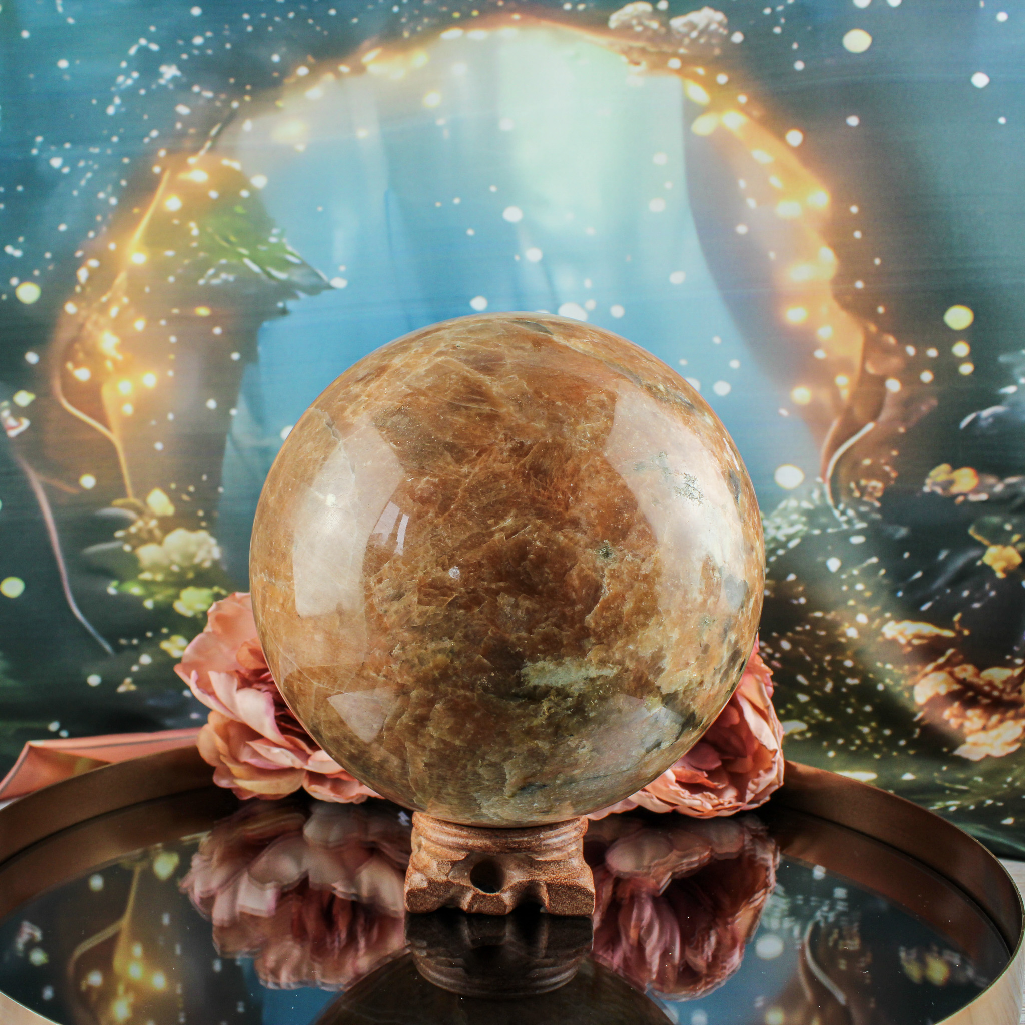 Prachtig grote perzik maansteen bol i.c.m. rookkwarts inclusief houder van de foto. Deze bol heeft ook een beetje flash. De afmeting is ongeveer 13,5 cm en het gewicht is 4416 gram.