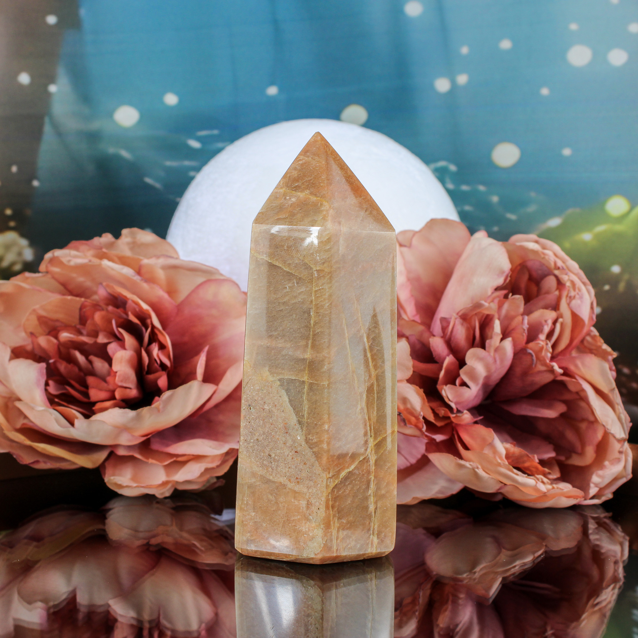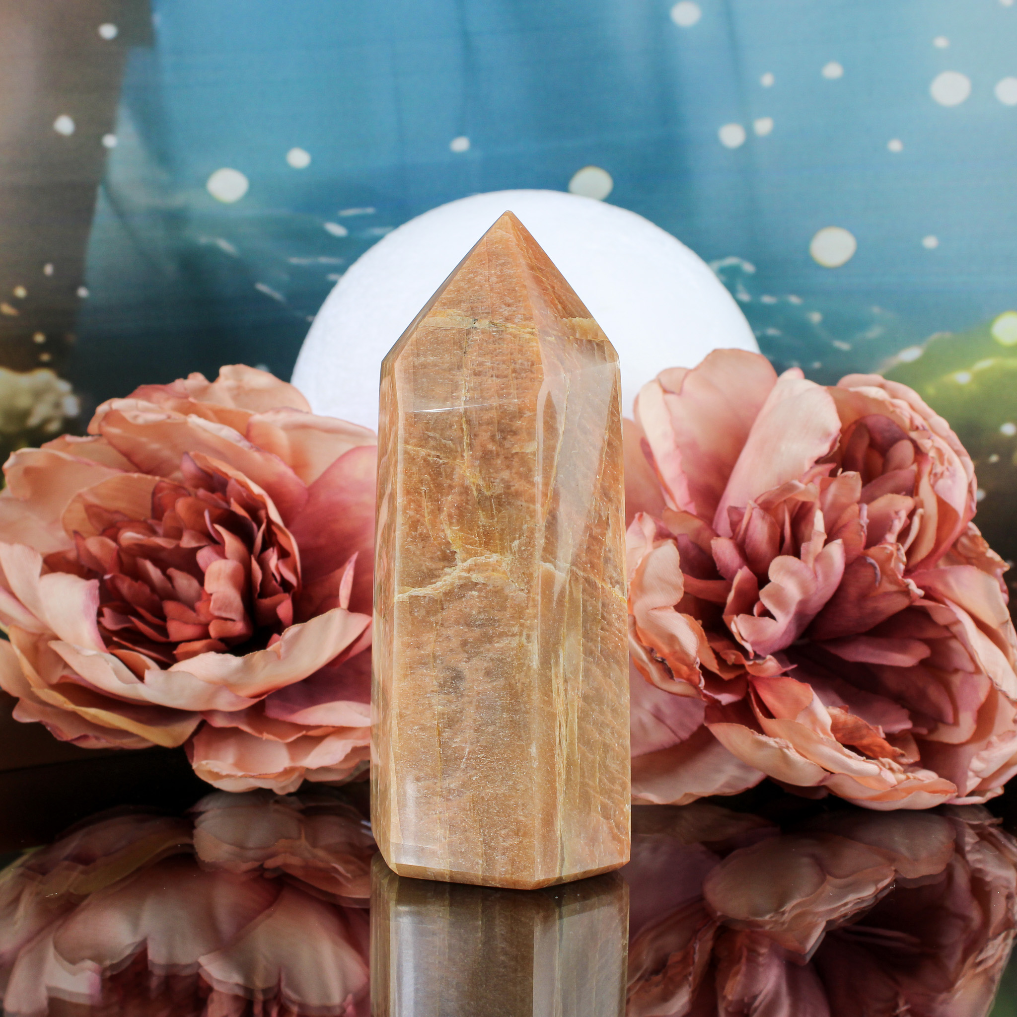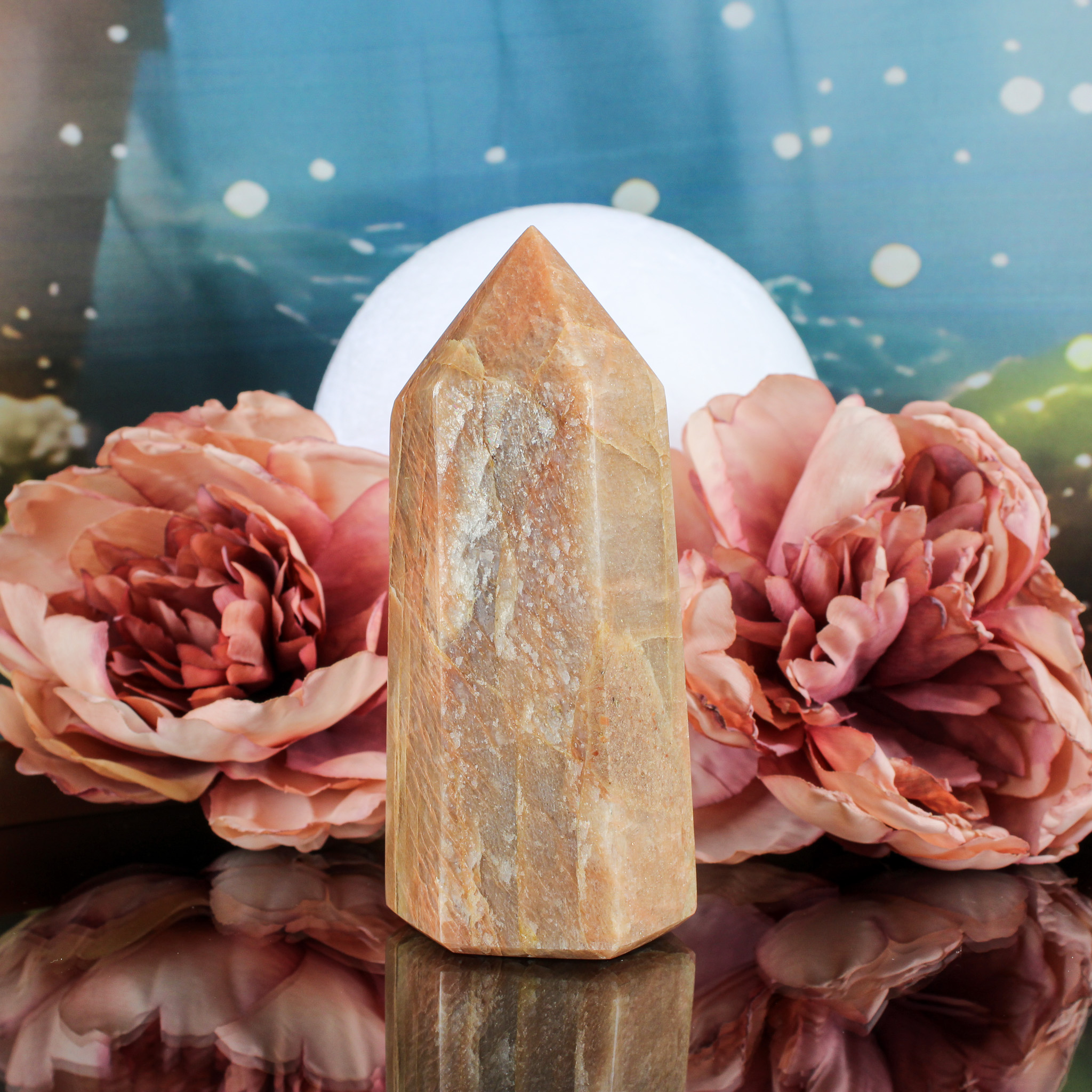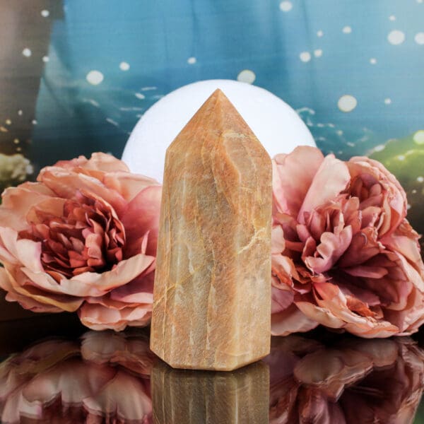 Mooie perzik maansteen punt met flash. De afmetingen zijn L 4,5 x B 5 x H 11,4 cm en het gewicht is 371 gram.