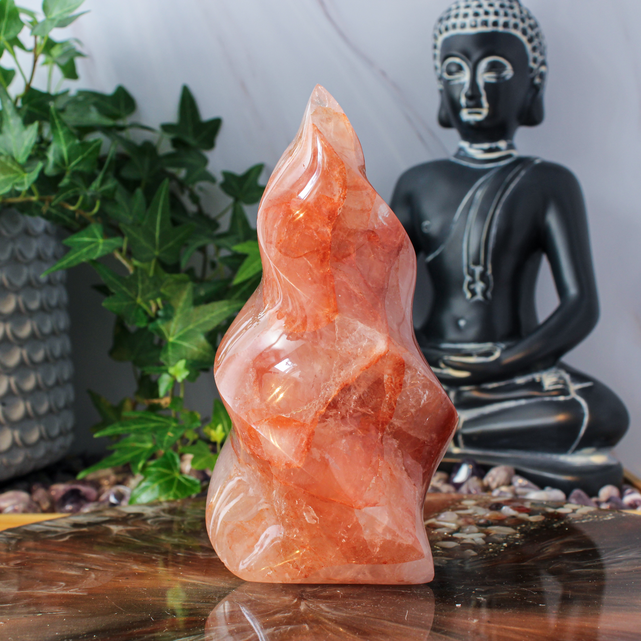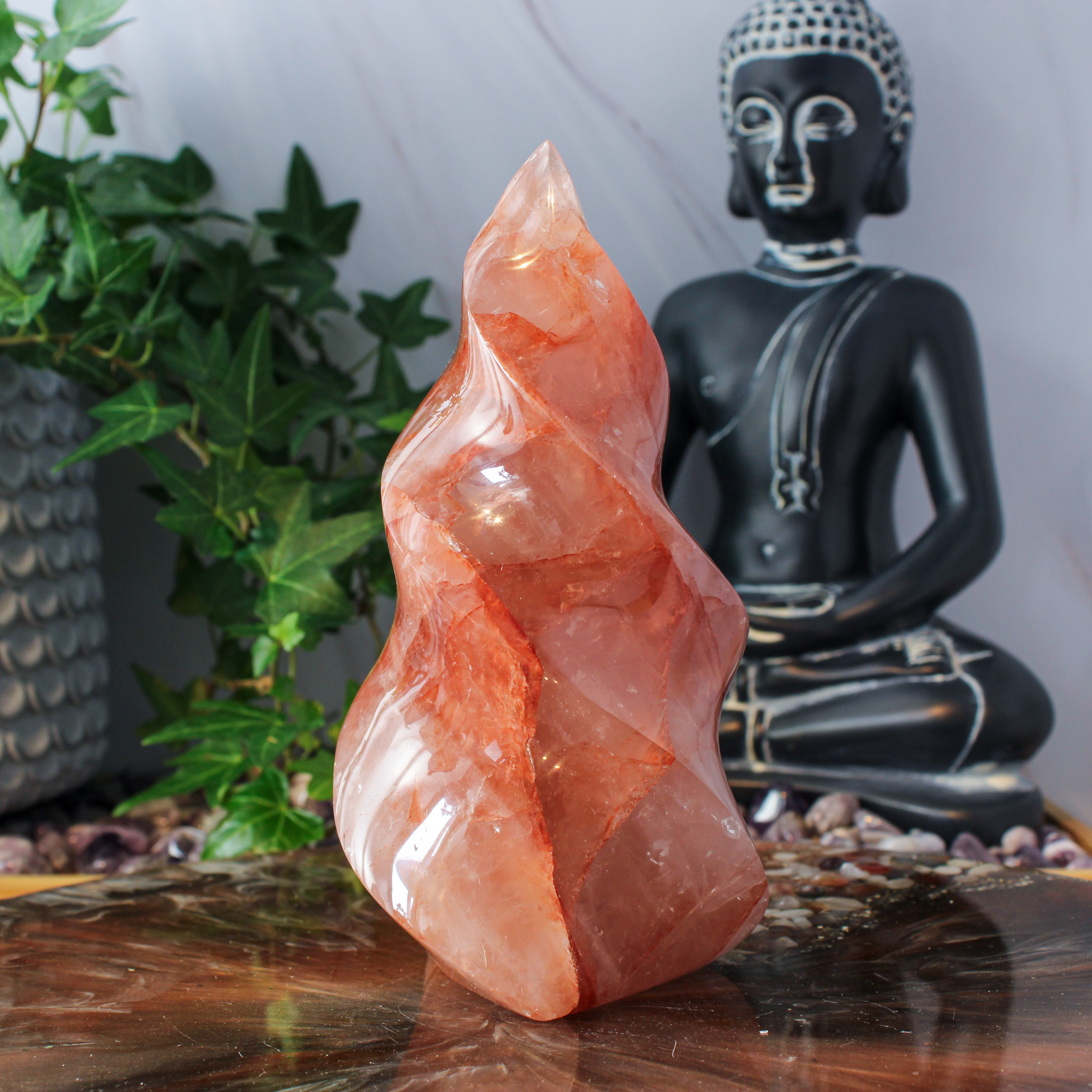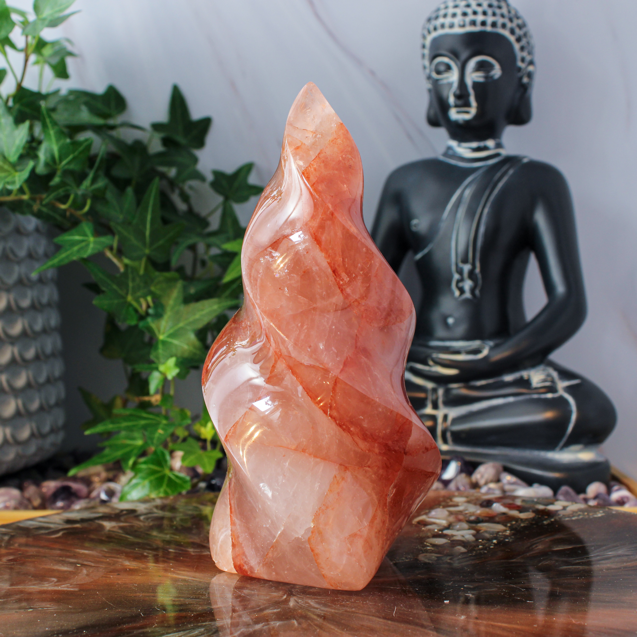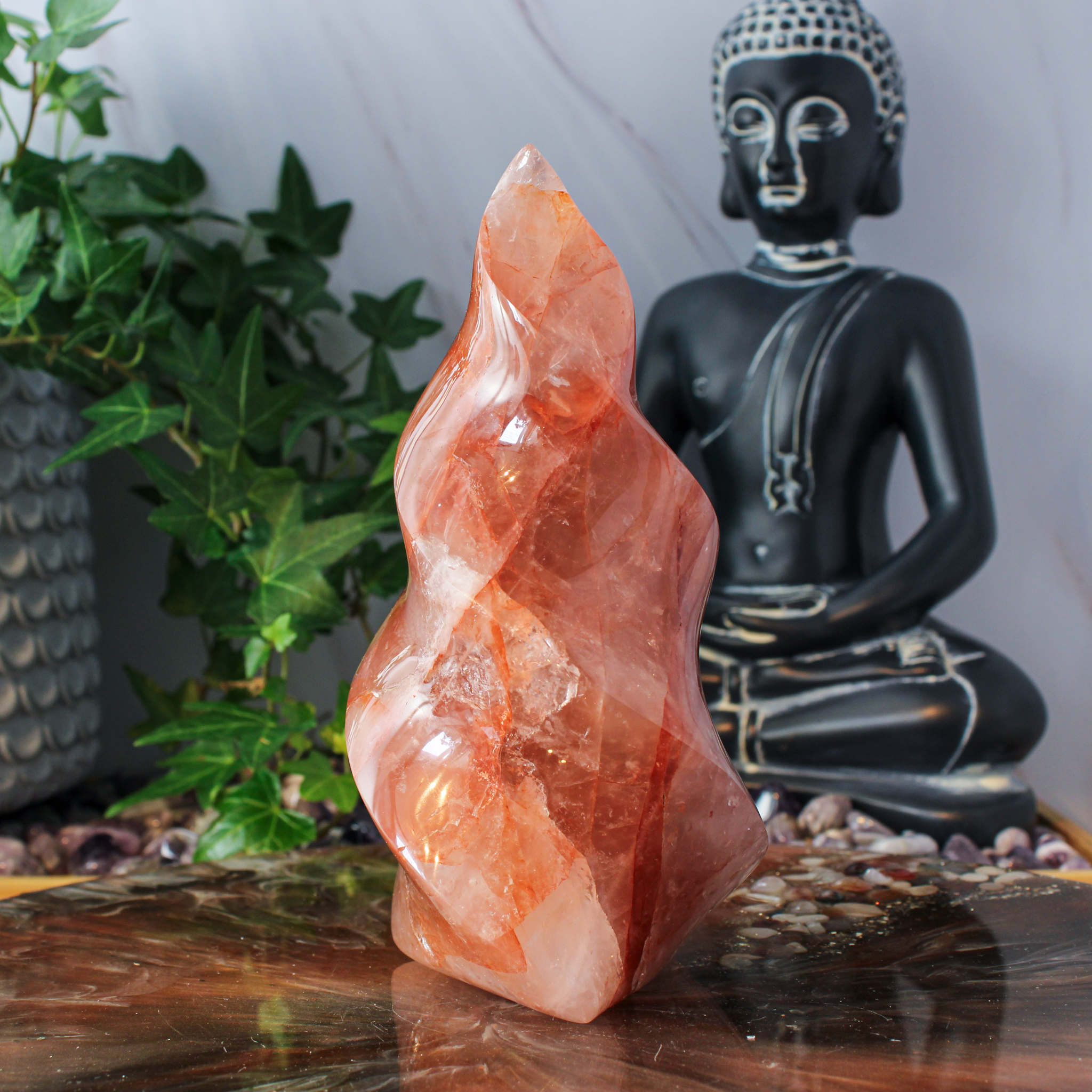 Deze red healer vlam is een bijzonder natuurproduct met een krachtige en warme uitstraling. Red healer is een vorm van kwarts waarin natuurlijke ijzerinsluitsels aanwezig zijn. Deze geven de steen haar kenmerkende warme tinten en zorgen voor een levendig en karaktervol geheel.