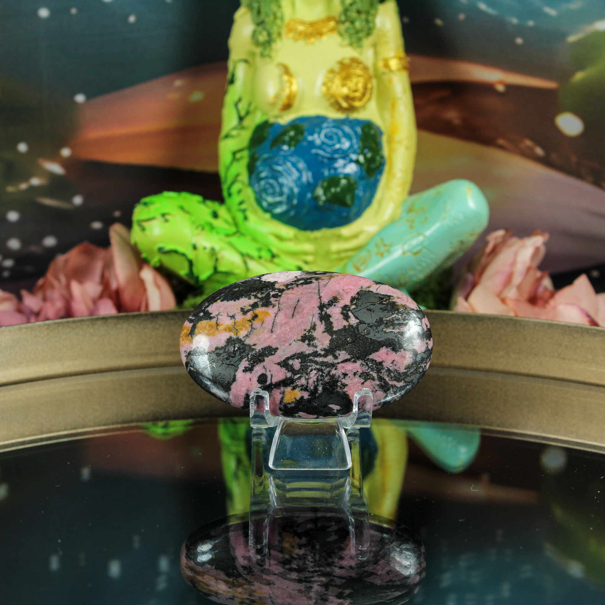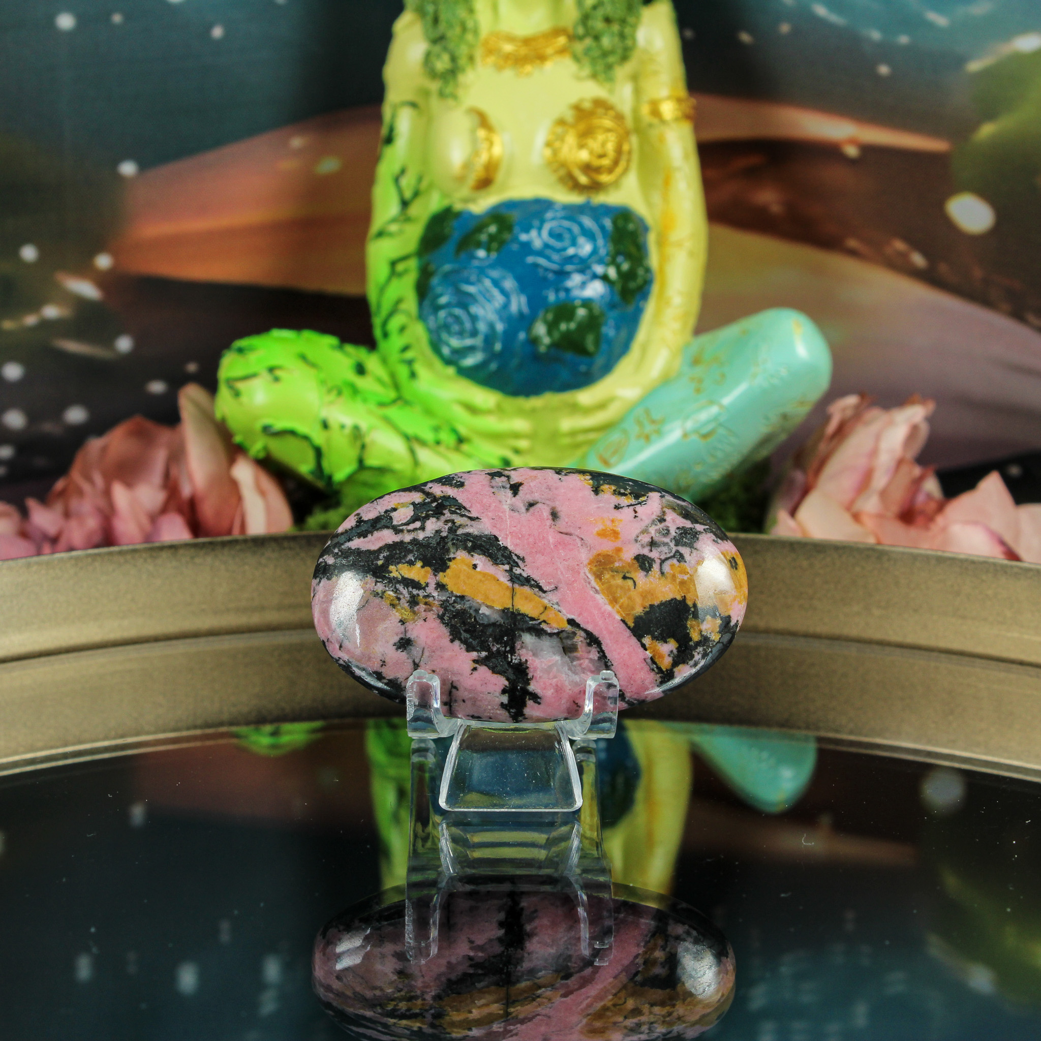 Ook zonder spirituele insteek is rhodoniet een prachtig natuurproduct. De warme roze tinten met hun donkere accenten geven sfeer en karakter aan elke ruimte. Leg haar bijvoorbeeld op een houder of in een schaal met andere stenen, zodat haar natuurlijke tekening goed zichtbaar is. Zo voeg je een vleugje kleur en elegantie toe aan je interieur.