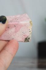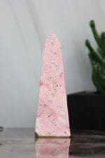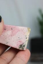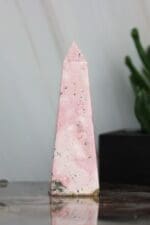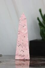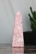 Mooie rhodoniet punt afkomstig uit Peru. De afmetingen zijn L 2,7 x B 2,6 x H 8,4 met een gewicht van 108 gram. Er zit een korting op i.v.m. een paar kleine imperfecties, zie laatste twee foto’s.