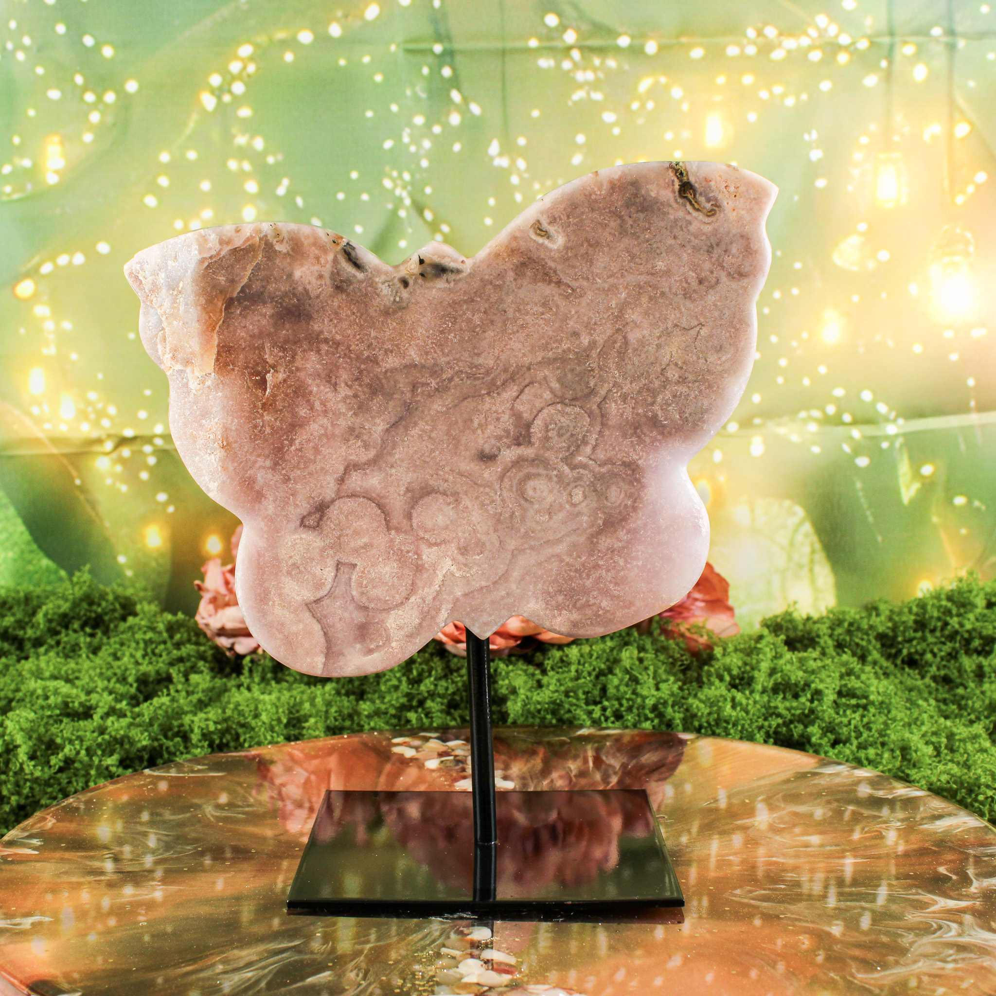 Als decoratief object is deze roze amethist vlinder een echte blikvanger. De vorm, het kleurverloop en de natuurlijke tekening maken elk exemplaar bijzonder. Zij staat prachtig op een kast, plank, vensterbank of tussen andere edelstenen.