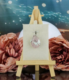 – Een zilverkleurig hartje met daarin een rozenkwarts bolletje, symbool voor liefde en emotionele balans.