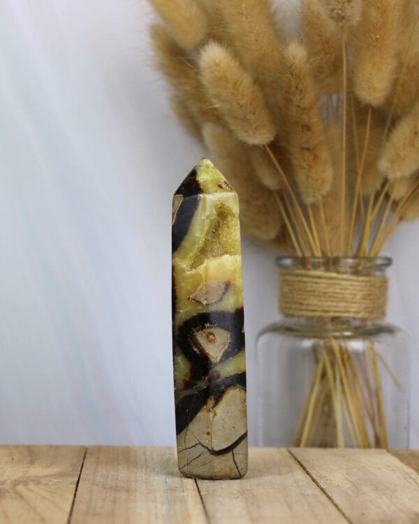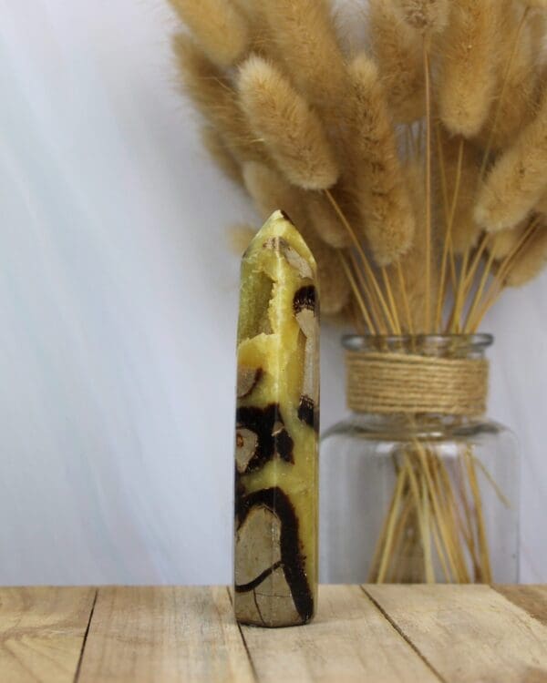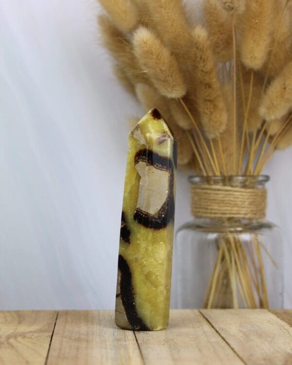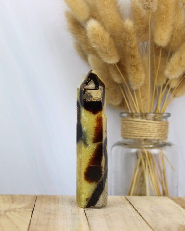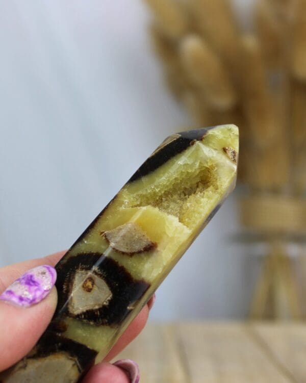 Deze septarie punt heeft een mooie natuurlijke opening. De afmetingen zijn L 2,3 x B 2,5 x H 11,3 cm. Het gewicht is 123 gram.