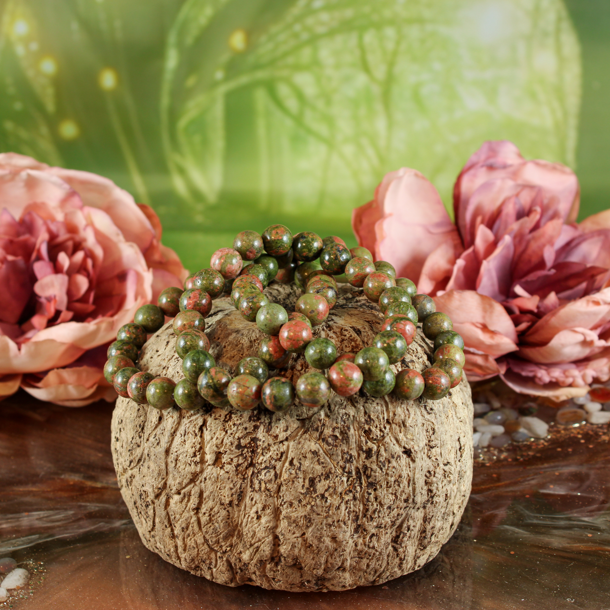 Deze unakiet armband 8 mm is een stijlvolle armband met een zachte en natuurlijke uitstraling. De kralen tonen een mooie mix van groen- en rozetinten die samen een levendig en harmonieus kleurenspel vormen. De natuurlijke patronen lopen speels door elkaar heen, waardoor elke kraal een eigen uitstraling heeft. Geen kraal is hetzelfde, wat de armband een uniek en natuurlijk karakter geeft.