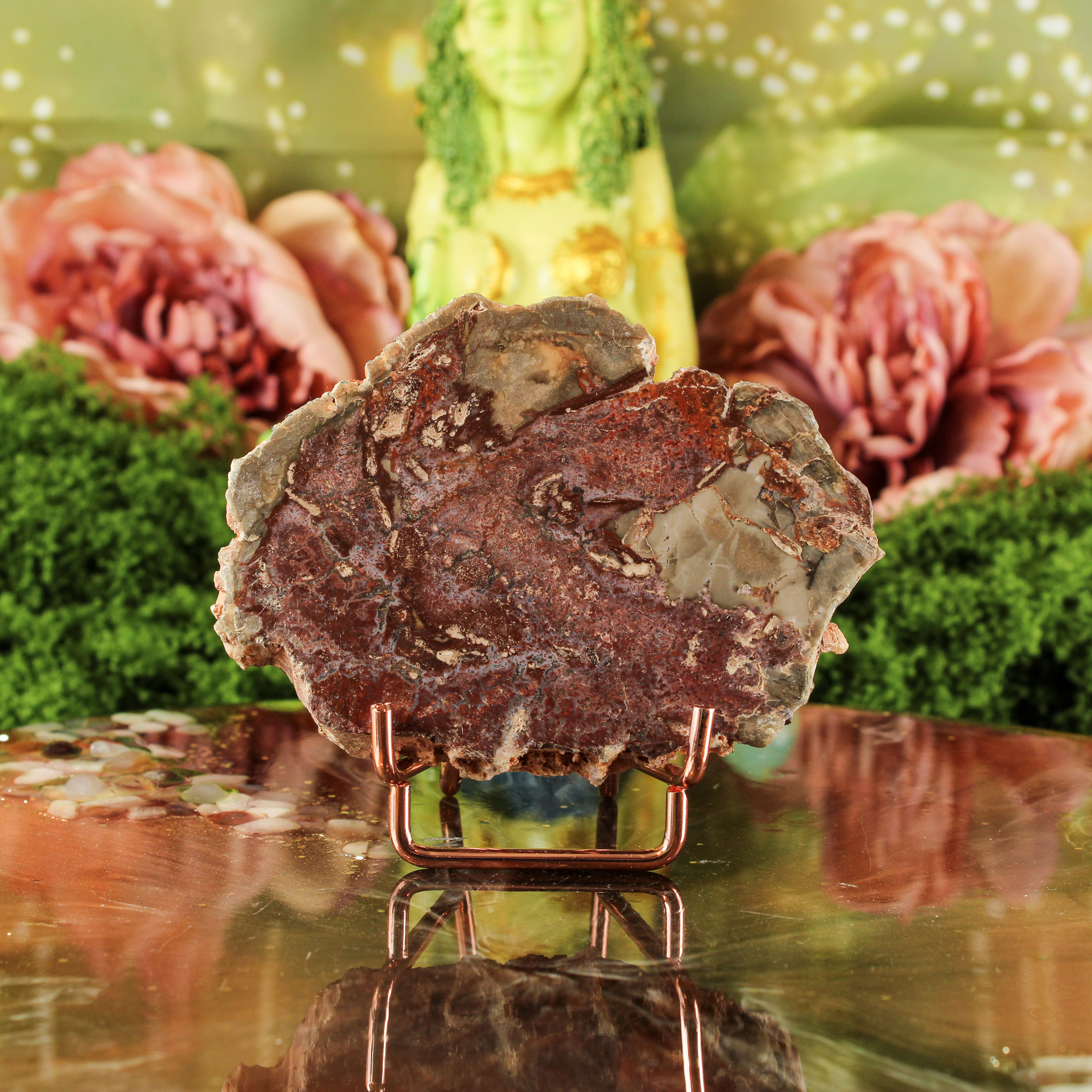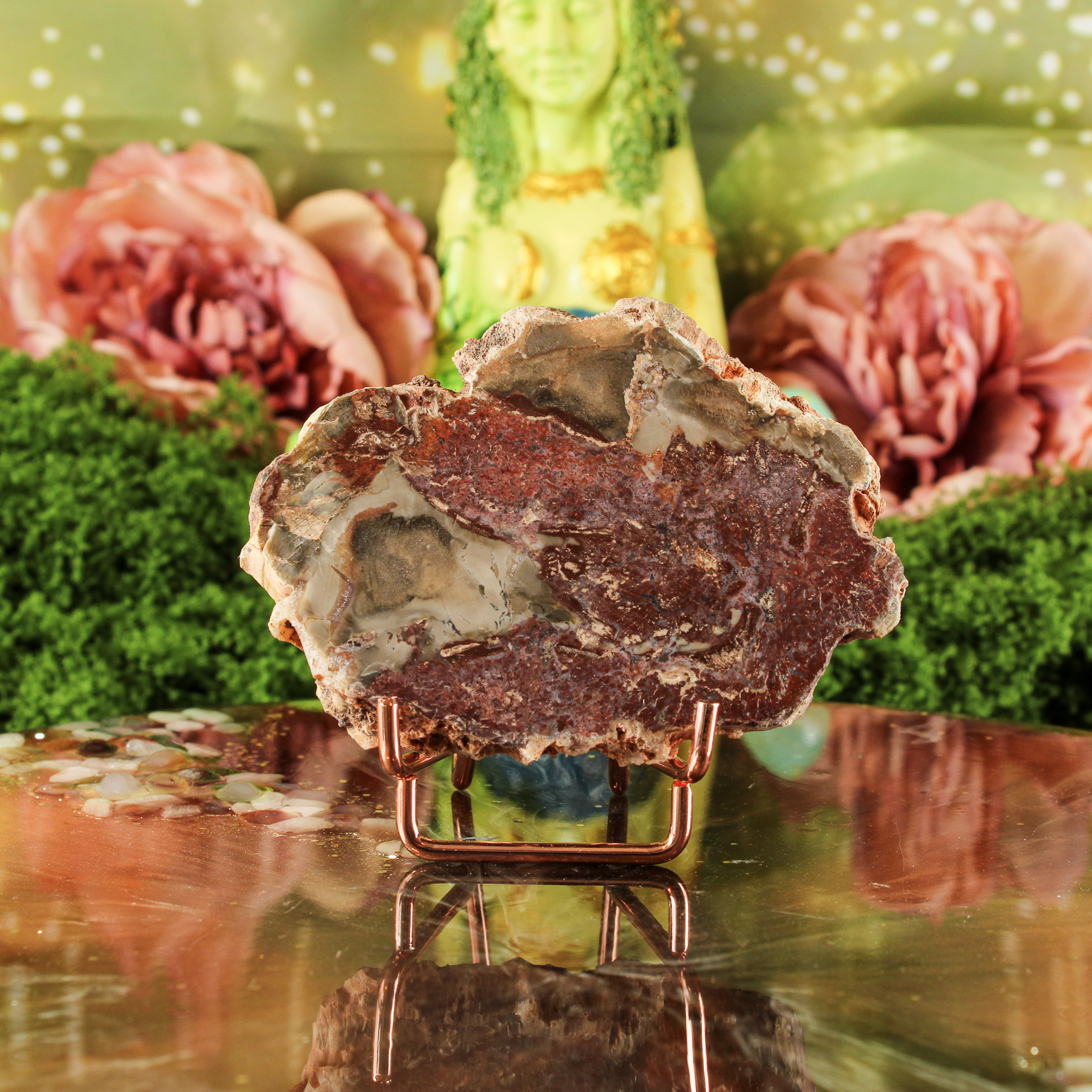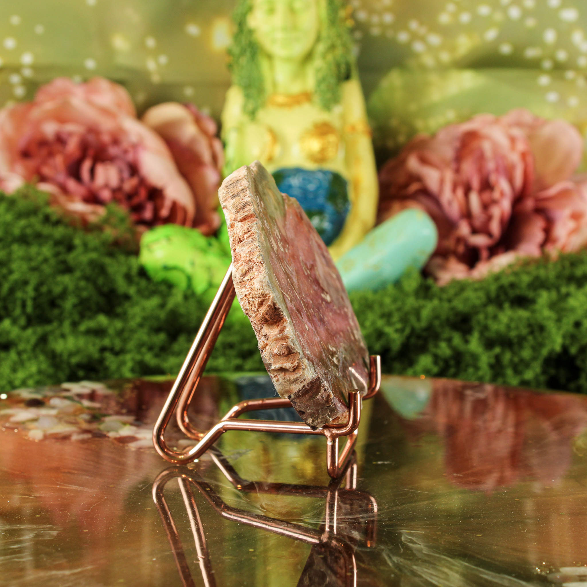 Daarnaast symboliseert versteend hout groei, geduld en innerlijke kracht. Ze herinnert eraan dat alles in zijn eigen tijd evolueert — net als het hout dat door de eeuwen heen in steen veranderde. Haar energie voelt kalm en beschermend, alsof ze je stevig met beide voeten op de grond zet. Ze ondersteunt bij het vinden van balans tussen actie en rust, en helpt je om met vertrouwen in het moment te blijven.