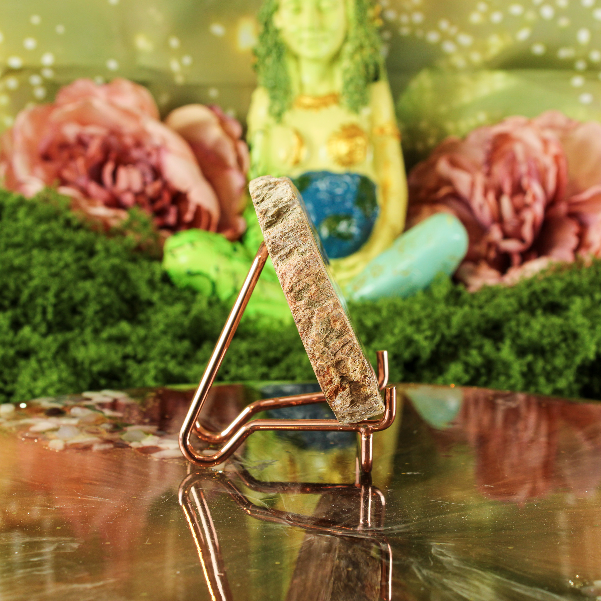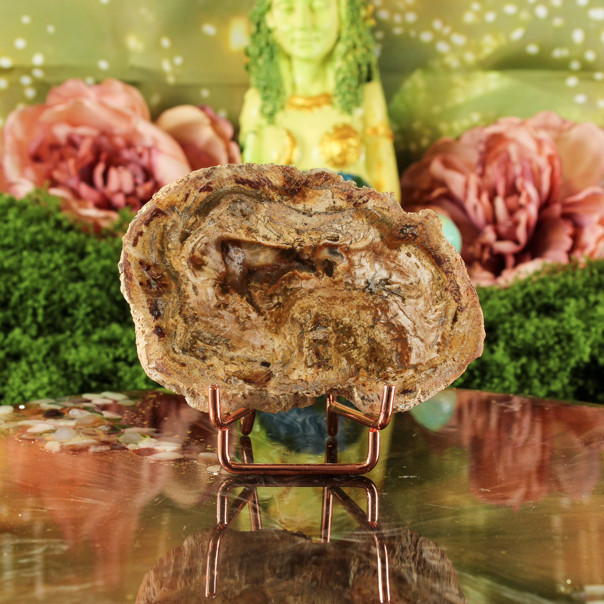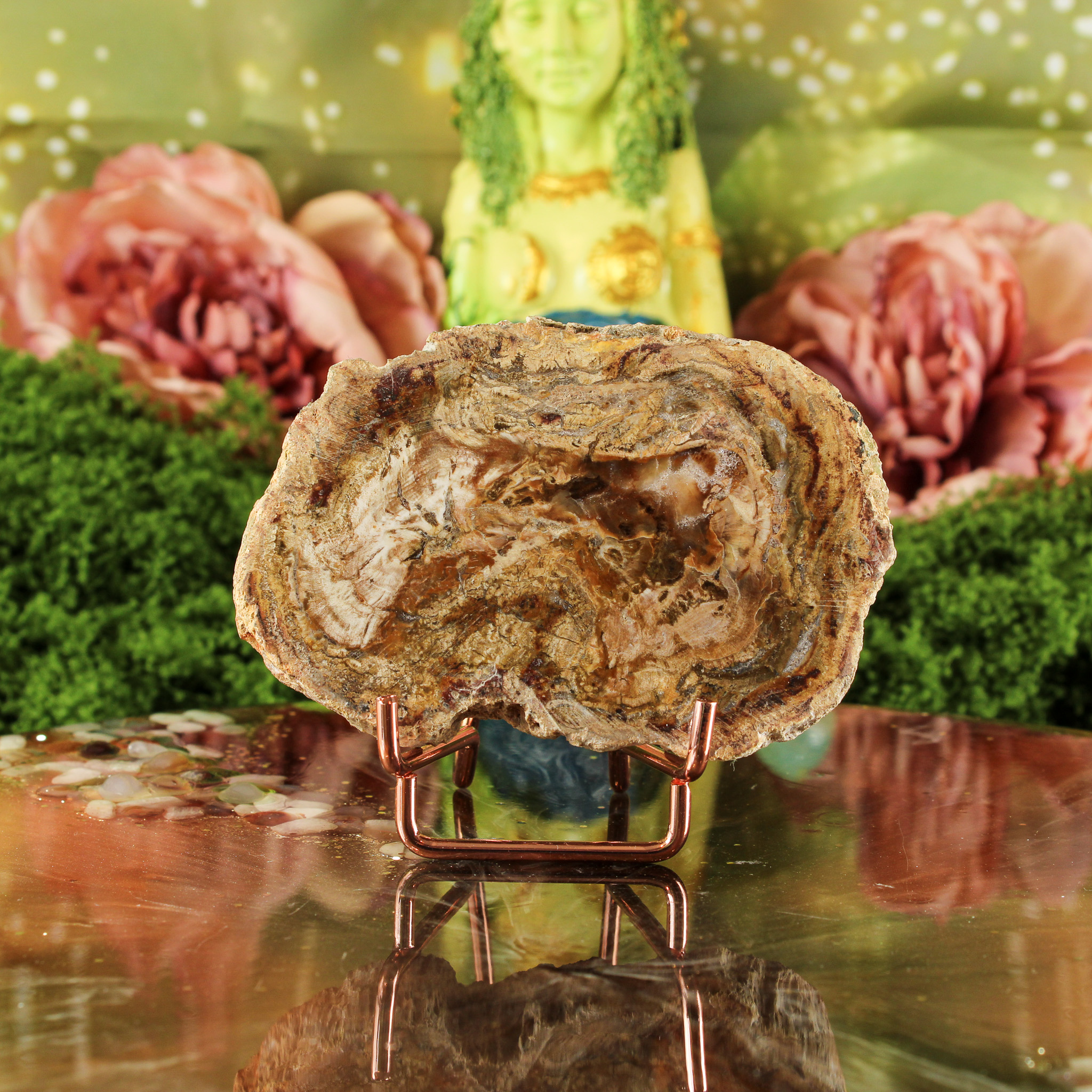 Daarnaast symboliseert versteend hout groei, geduld en innerlijke kracht. Ze herinnert eraan dat alles in zijn eigen tijd evolueert — net als het hout dat door de eeuwen heen in steen veranderde. Haar energie voelt kalm en beschermend, alsof ze je stevig met beide voeten op de grond zet. Ze ondersteunt bij het vinden van balans tussen actie en rust, en helpt je om met vertrouwen in het moment te blijven.