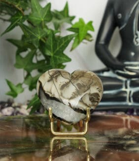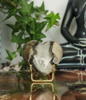 De hartvorm geeft deze steen een zachte en warme uitstraling. Tegelijk blijft de natuurlijke kracht van vulkaan agaat mooi zichtbaar in de tekening van de steen.