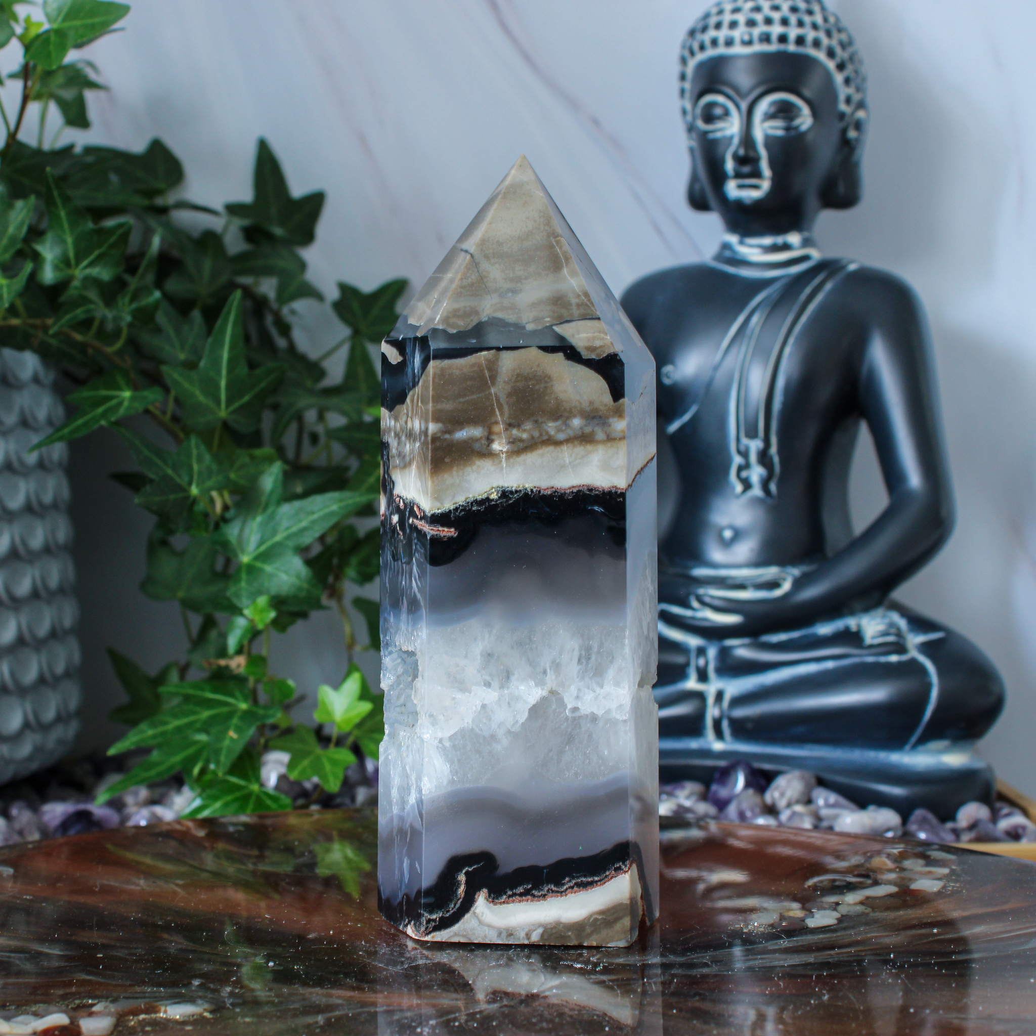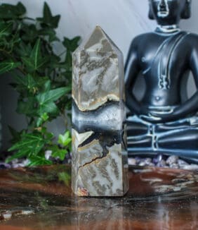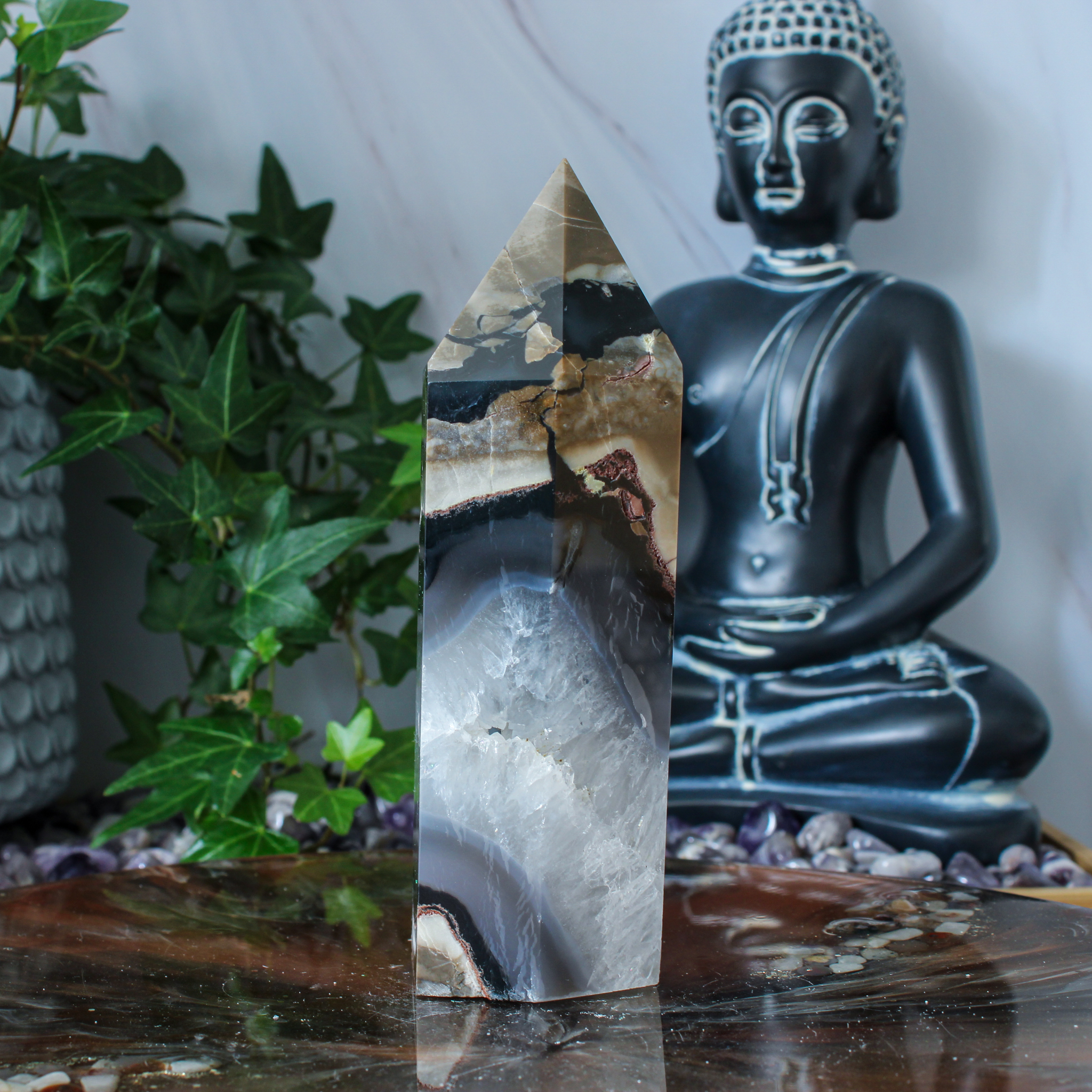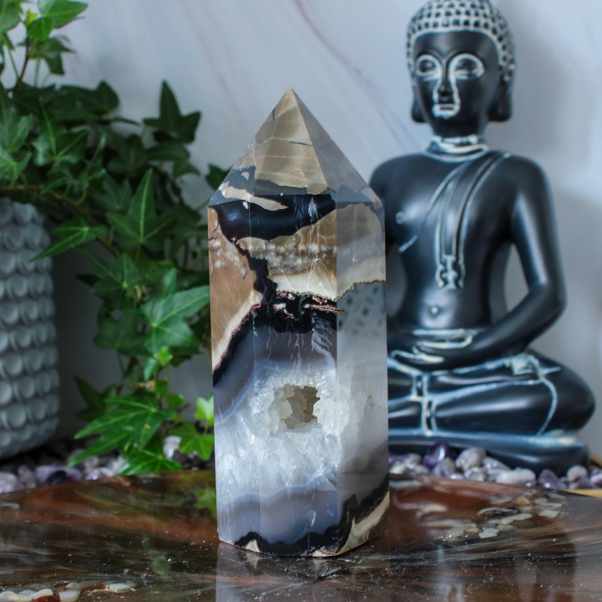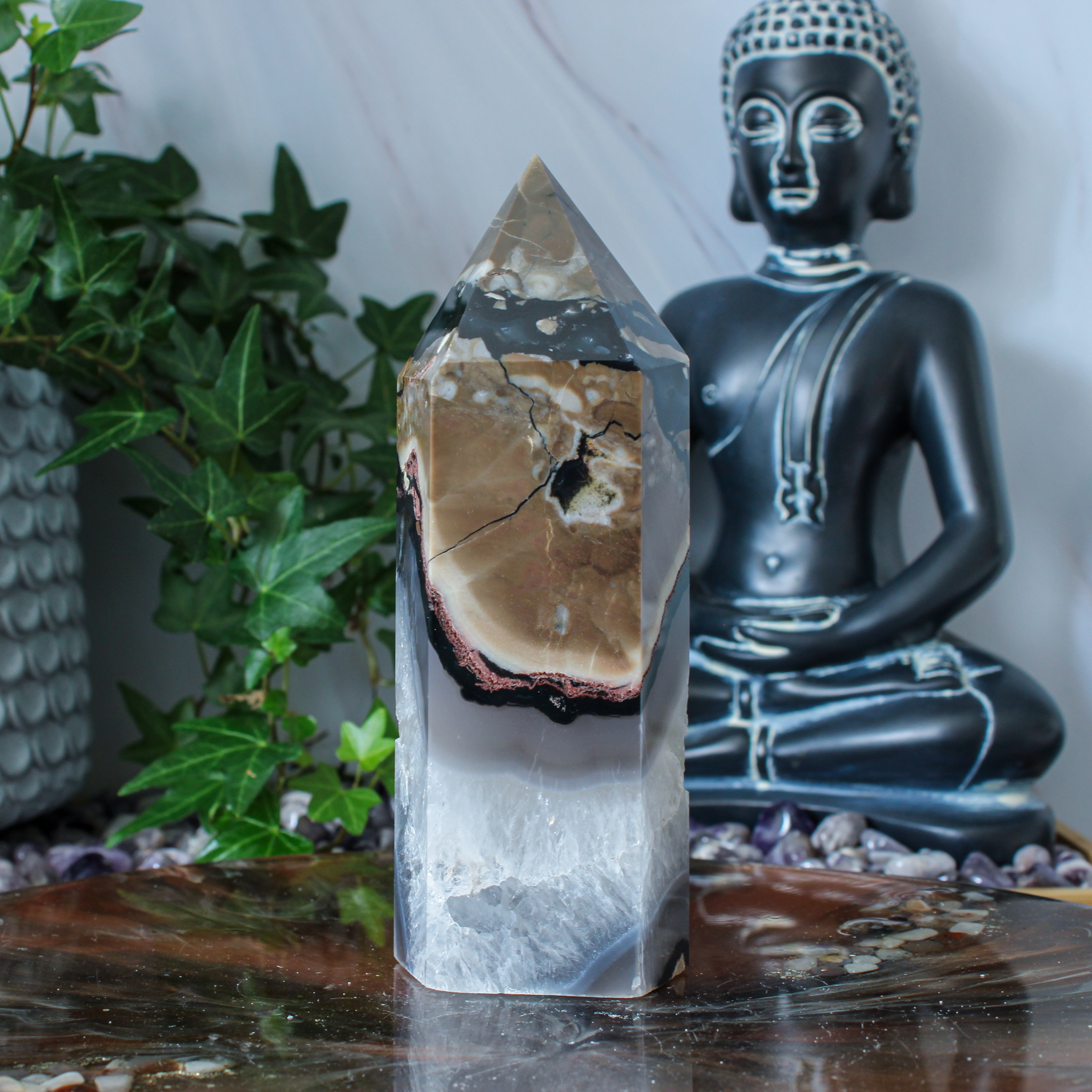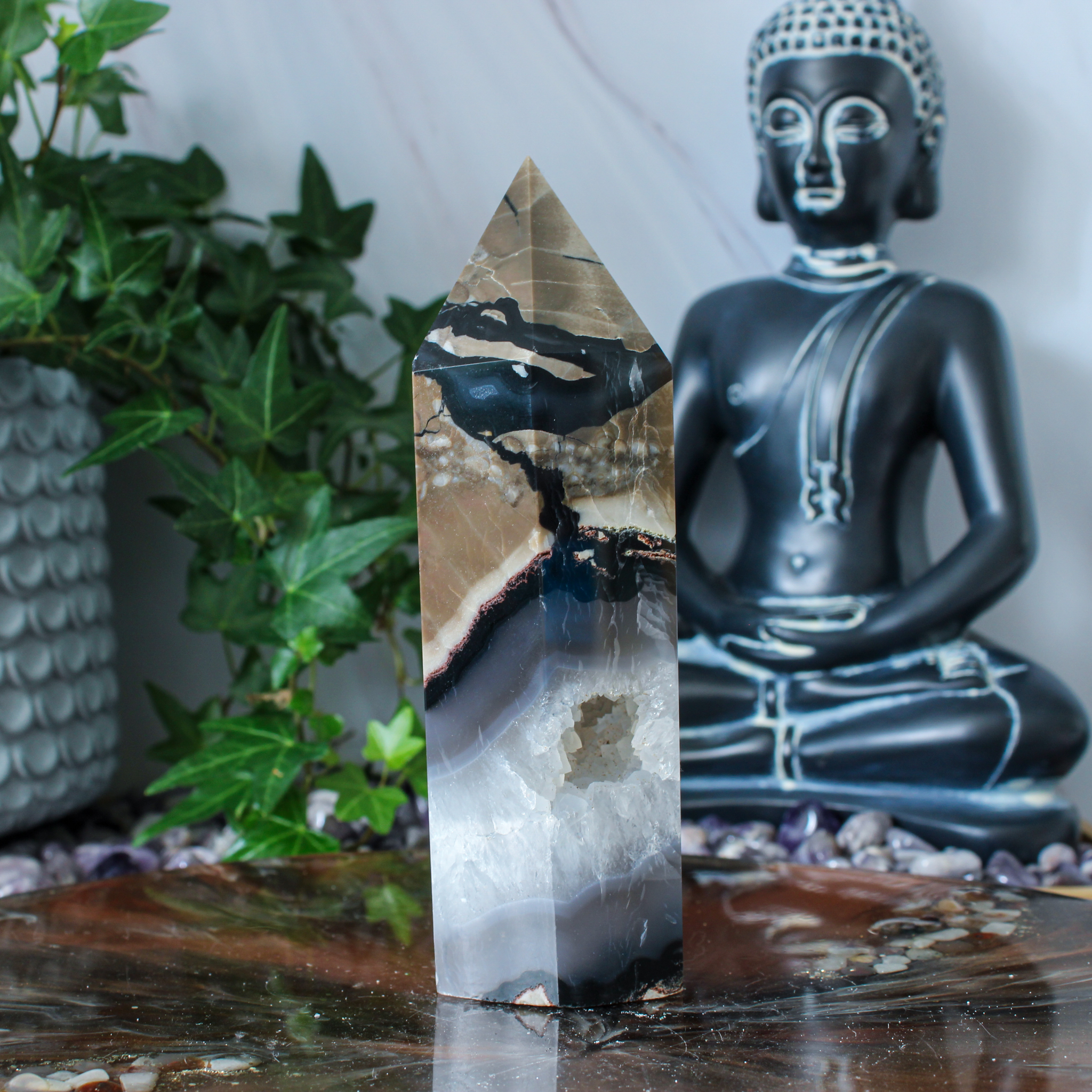 Dankzij haar natuurlijke karakter past deze vulkaan agaat punt in verschillende interieurs. Zo haal je met deze vulkaan agaat punt een uniek stukje natuur in huis dat rust, kracht en een fijne sfeer met zich meebrengt.