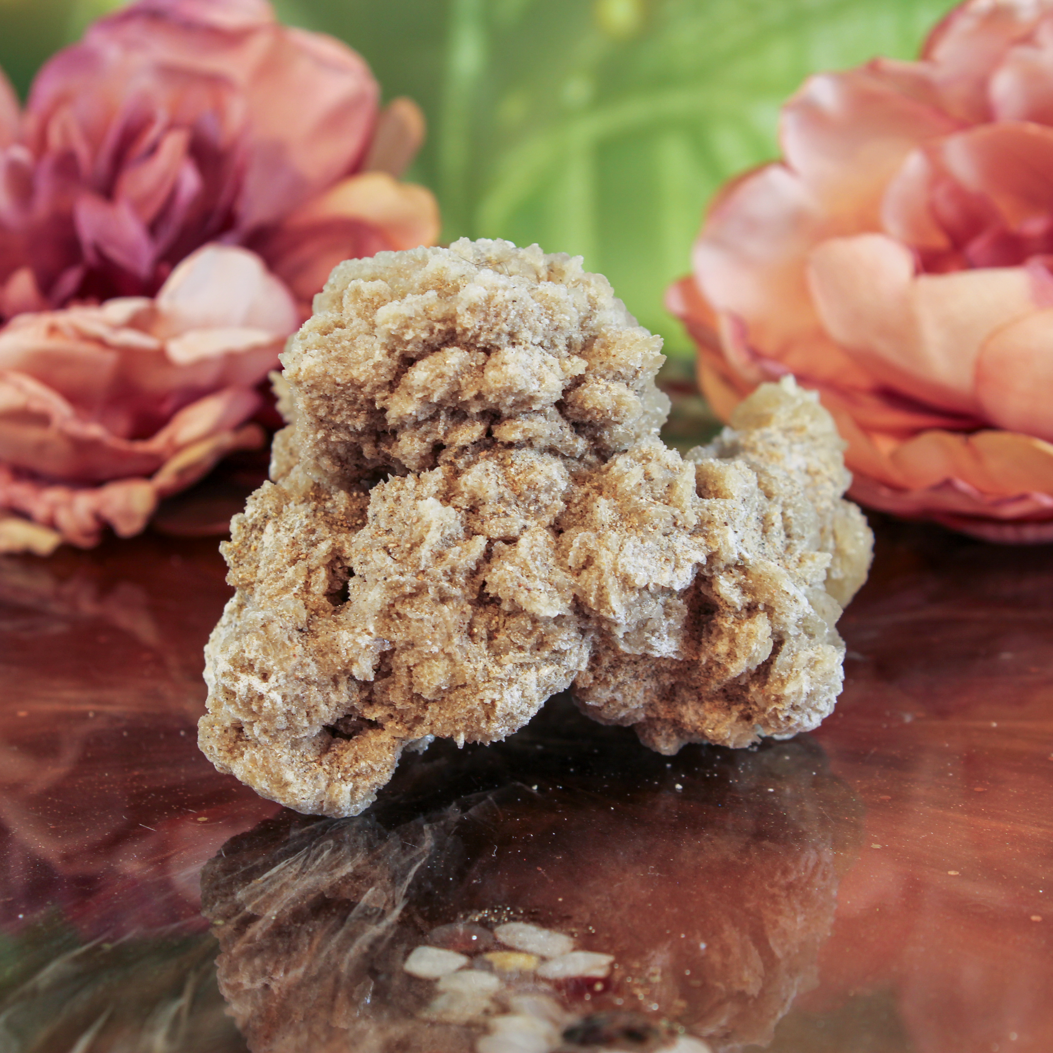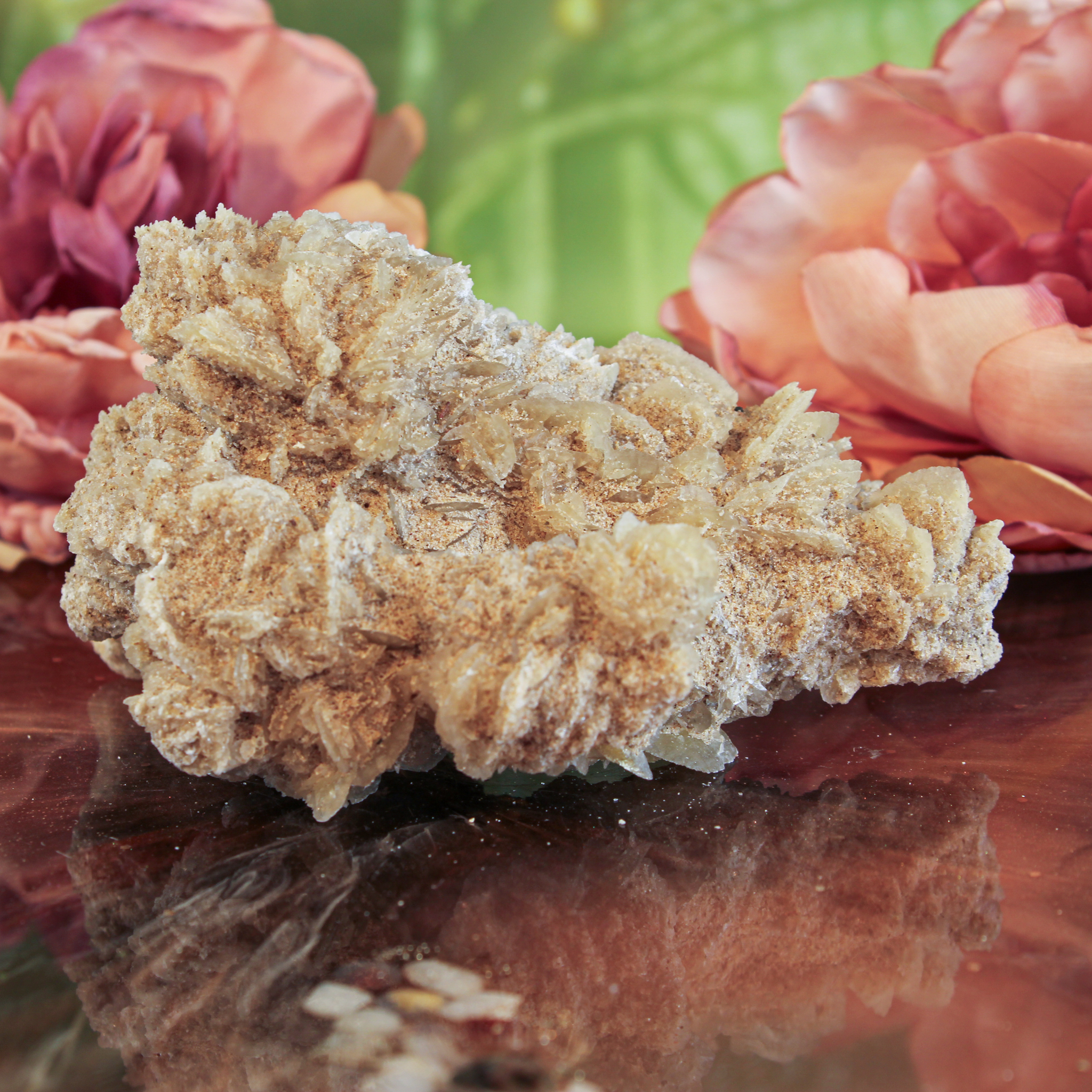 Deze woestijnroos ruw is een bijzonder natuurproduct met een zachte, aardse uitstraling. Woestijnroos ontstaat in droge gebieden, wanneer zand, mineralen en gips of bariet samen kristalliseren. Tijdens dit natuurlijke proces vormen zich bloemachtige structuren die doen denken aan rozen, vandaar de naam. Daardoor krijgen de lichte beige tot zandkleurige tinten een warme en natuurlijke uitstraling.